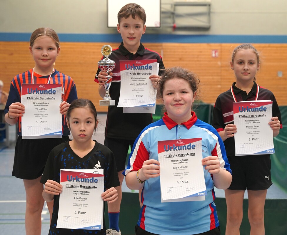 Die 13er Jugend-Konkurrenz wurde dominiert von Spielern des TTC Heppenheim, die sich die Plätze eins bis drei sicherten. Ein 9:0-Ergebnis erzielte dabei Joscha Knobloch. Marie Kartascheff war bei den Mädchen nicht zu bezwingen (4:0). Und bei den jüngsten Mädchen (11) gewann Ronja Jäger (TTC Heppenheim) den Siegerpokal.