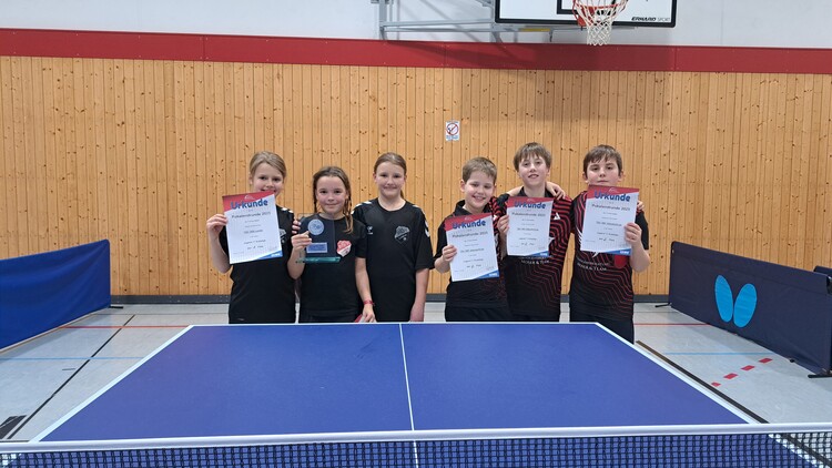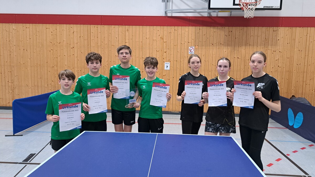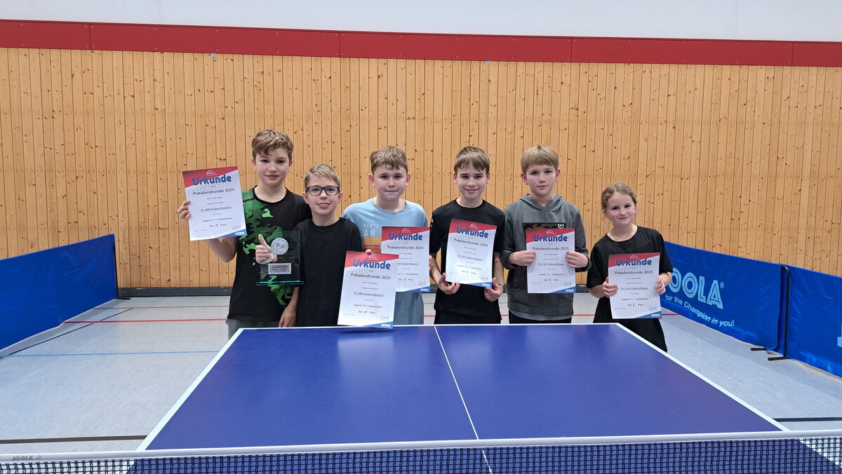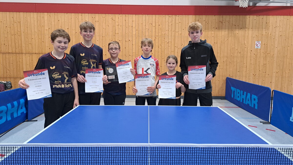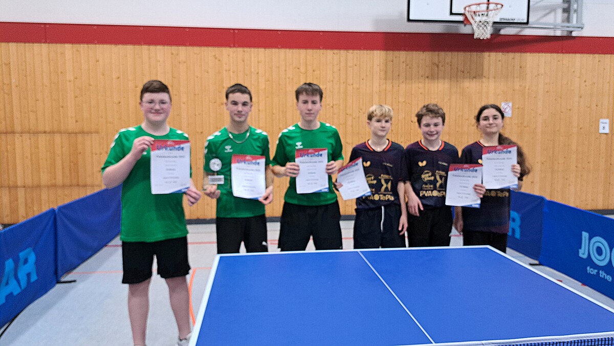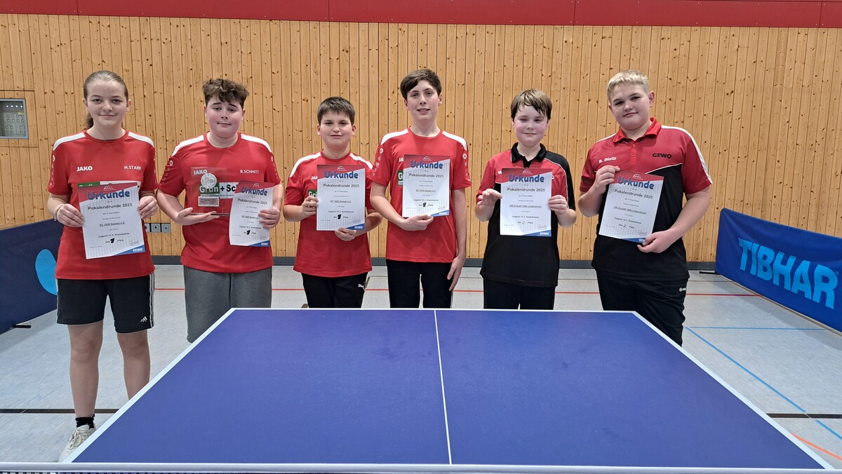 Jugend13/1. Kreisklasse: Die beiden Halbfinalbegegnungen waren nach 35 bzw. 75 Minuten zu Ende, das Endspiel dauerte dann zwei Stunden. Der TSV Grünberg konnte sich gegen den TTC Rödgen nur einen Satzgewinn gutschreiben, den TSF Heuchelheim gelang durch Jonas Reimann/Henri Grün wenigsten der Ehrenzähler gegen den TV Großen-Buseck. Das Endspiel erfuhr eine Vorentscheidung, als David Krämer/Clara Hundt gegen Kursa/Schock mit 2:0 führten, das Busecker Duo aber noch zum Sieg kam. Zuvor hatte David Krämer gegen Tim Schneider gewonnen, Krämer gewann später auch sein zweites Einzel gegen Kursa. Aber Noah Schock gewann für den TV zweimal, dazu kamen die Siege im Doppel und der von Kursa gegen Hundt. Damit war der TV-Pokalsieg perfekt.