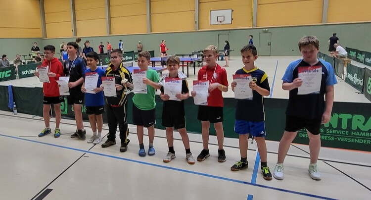 Jungen 11: 1. Batuhan Bülbül (Eintracht Baunatal), 2. Jonas Graf (SC Niestetal), 3. Felix Brehm, 4. Bennet Klippert (beide TTC Todenhausen), 5. Leon Richter (TTC Lüdersdorf), 6. Bogdan Popov (Eintracht Baunatal)