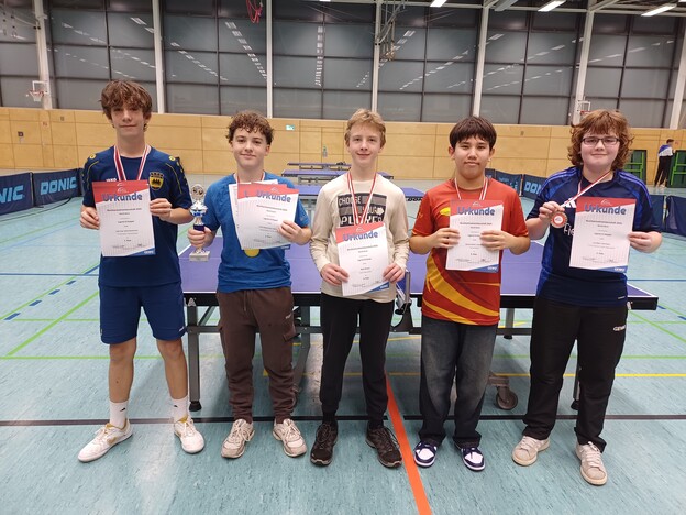 Jugend 15: 1. Anton Westermann, 2. Batuhan Bülbül (beide SC Niestetal), 3. Alvin Braun (Kasseler Spvgg. Auedamm) und Lukas Jung (TTC Anzefahr), 9. Nils Küblbeck, 17. Ben Dauzenroth (beide TTV Stadtallendorf) und Levi Straube (TSV Marbach)