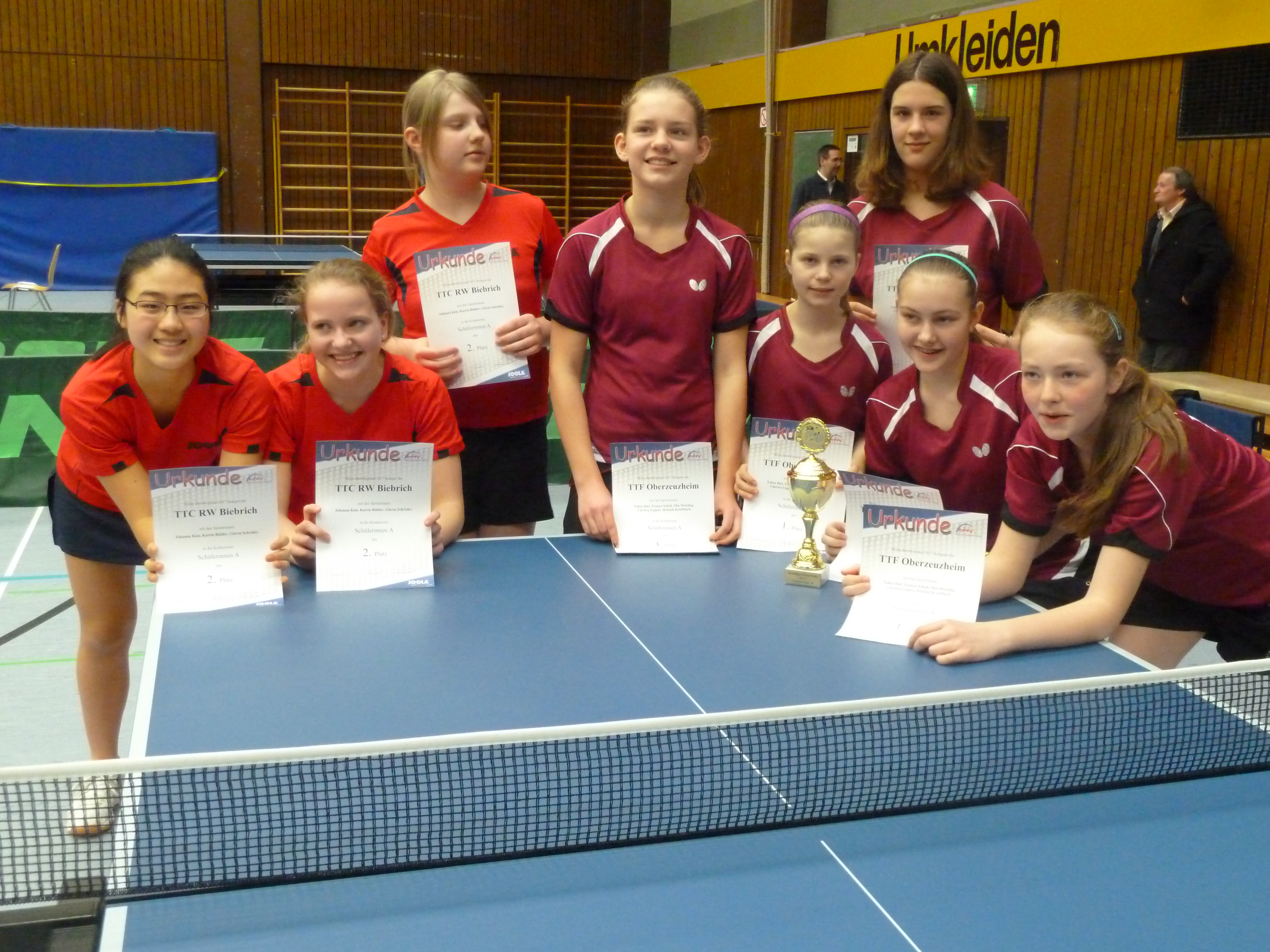 Bezirkspokalsieger 2018 Schülerinnen A (kreisgebunden) TTC Staffel (rechts) - 2. Platz RW Biebrich (links)