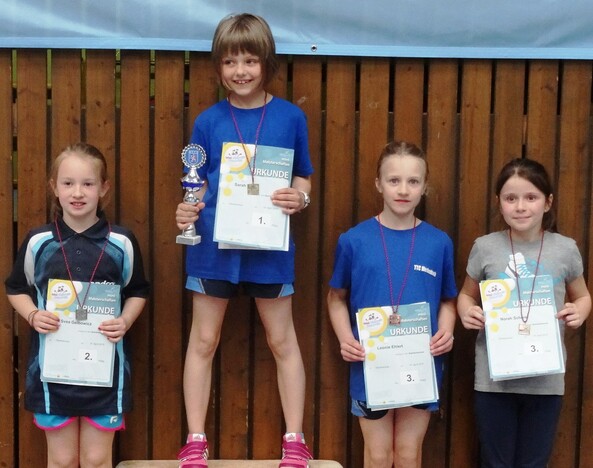 Nach den Erfolgen in Merkenbach, als sie den Ortsentscheid und danach sich in Dillenburg auf Kreisebene durchsetzten, glänzten Sarah Peter und Leonie Ehlert auf auf Bezirksebene. Bei den Mädchen U8 setzten sich Beide ungeschlagen in den Gruppenspielen durch. Sarah Peter spielte dann auch in der KO Runde groß auf und wurde ohne Niederlage die Nummer eins im Bezirk. Bis ins Halbfinale kam Leonie Ehlert, die dann gestoppt wurde und Rang drei belegte. Beide haben sich somit für die Wettkämpfe auf Landesebene am 9. Mai in Meerholz qualifiziert. In dieser Altersklasse war auch Laura Riske (Herborn) dabei, die in den Gruppenspielen scheiterte.