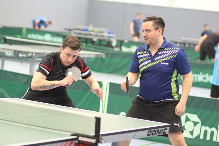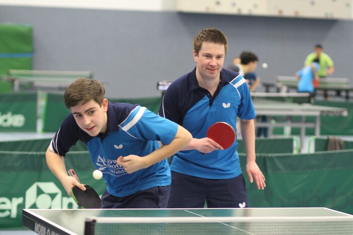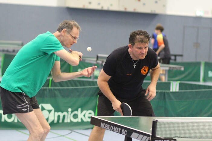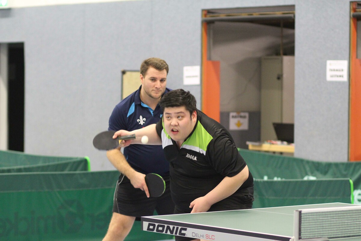 Einen holprigen Start legten Patrick Heymann/Yüyang Wang (SV Darmstadt 98/TG Obertshausen) in der Herren B-Klasse hin. Gegen Holger und Jonas Gräf (TTC Herbornseelbach) lagen sie 1:2 zurück, ehe sie durch den Erfolg der beiden Schlusseinzel 3:2 siegten. Danach war der Weg frei für Heymann/Wang, die nun alles 3:0 gewannen.