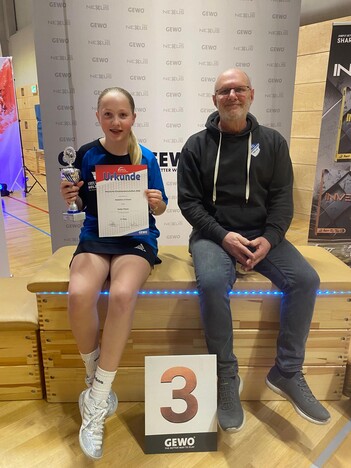 Maike startete bereits am Samstag in der Altersklasse M19 in den Wettbewerb. Die noch 12- jährige konnte hier erstaunlich gut mithalten und in der Gruppenphase sogar ein Spiel gewinnen. Im Doppel lief es noch besser. Mit ihrer Partnerin Cora Leißner vom TV Bad Orb schaltete sie zunächst das Doppel mit der Regionalligaspielerin Sophie Krießbach ( TTC Biebrich ) und Anna Schneider ( TTC Staffel ) aus, ehe beide im Halbfinale ausschieden.