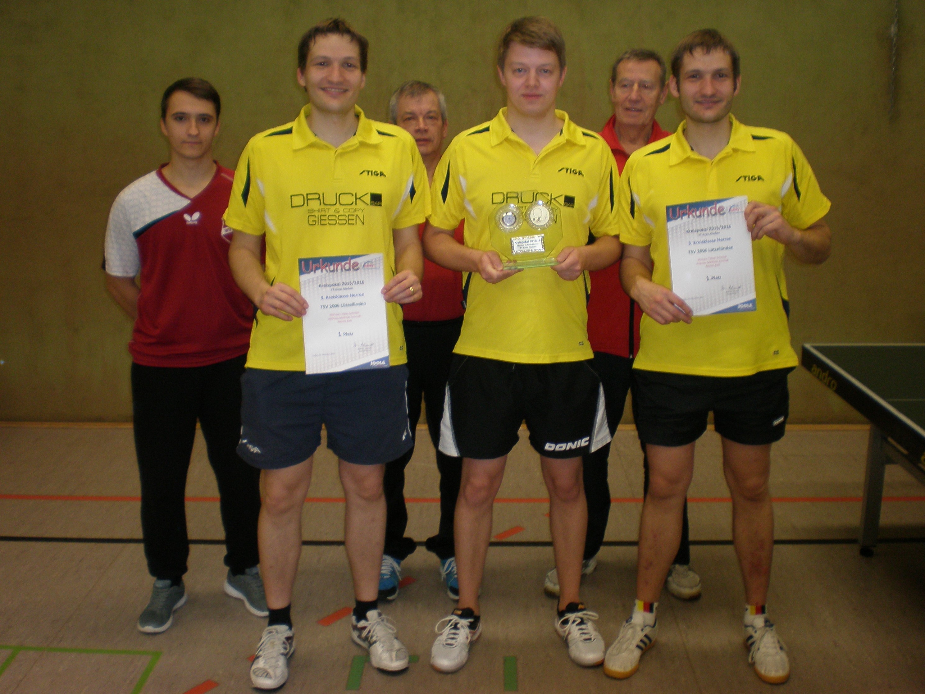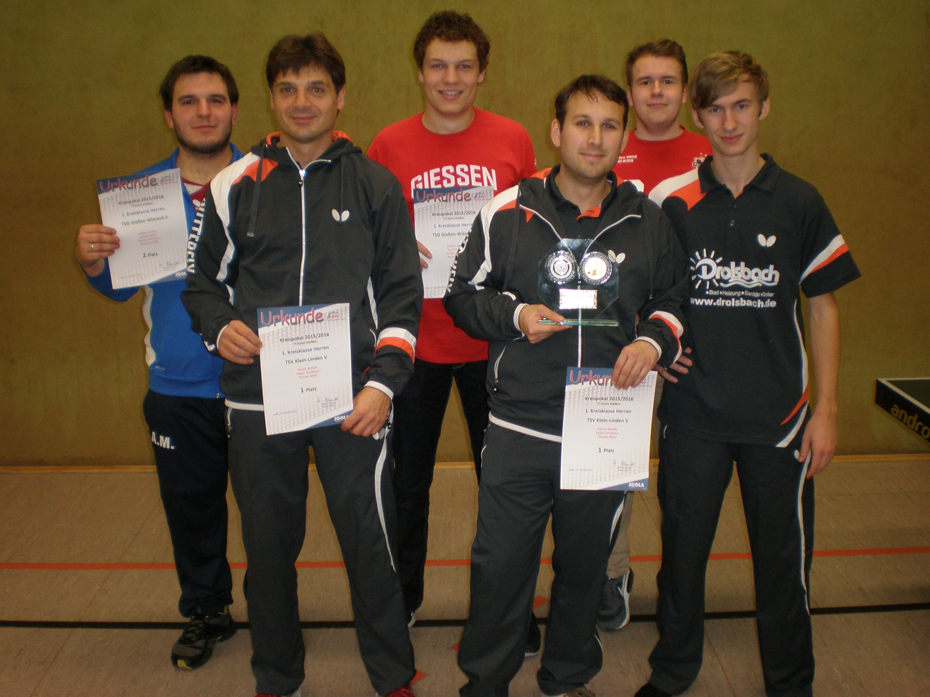 1. Kreisklasse Herren: Sieger TSV Klein-Linden V (vordere Reihe), Zweiter TSG Wieseck II (hintere Reihe). (Foto: Stefan Fritsche)