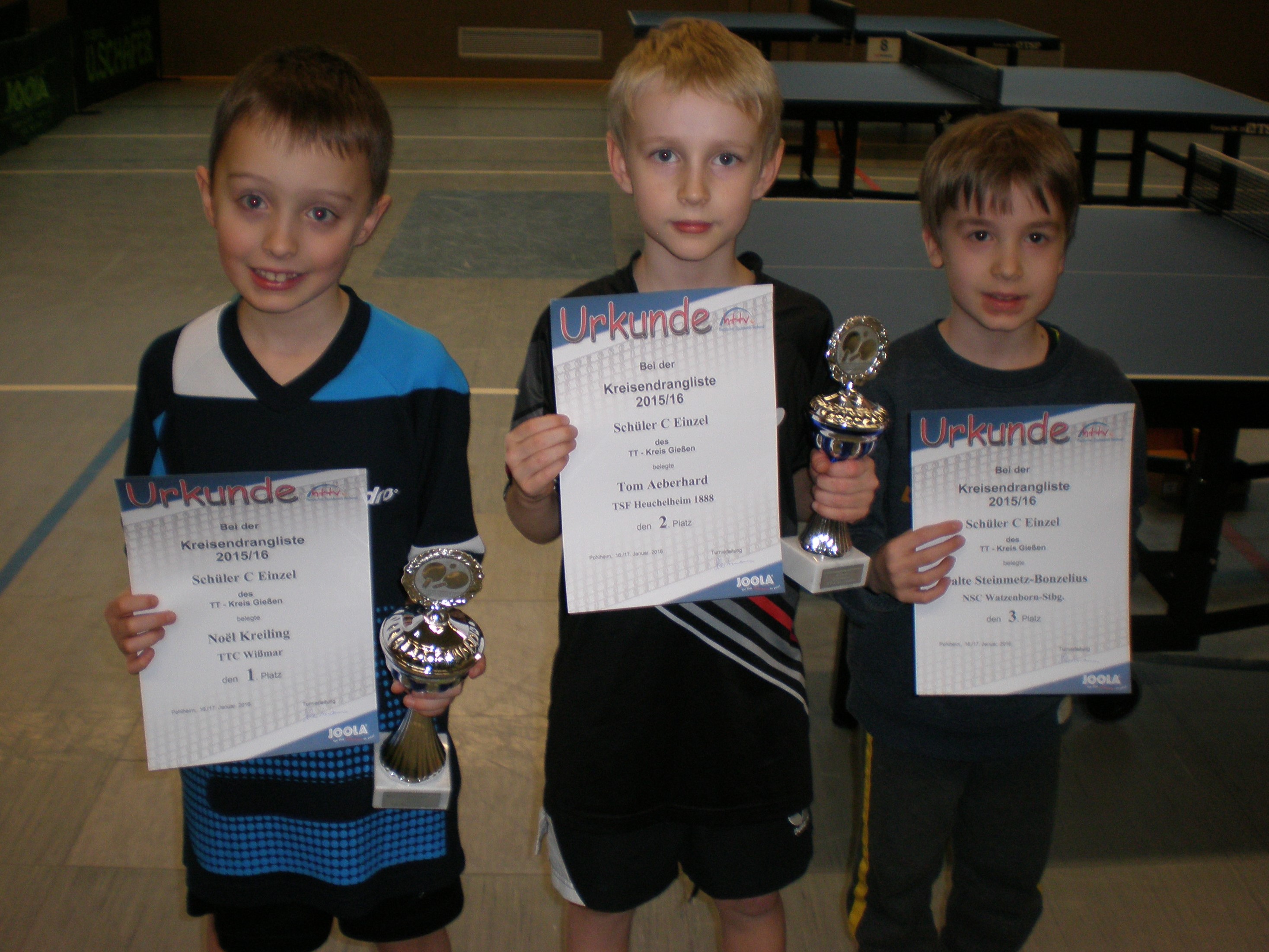 Schüler C Einzel (v.l.): 1. Noël Kreiling (TTC Wißmar), 2. Tom Aeberhard (TSF Heuchelheim), 3. Malte Steinmetz-Bonzelius (NSC W.-Steinberg).