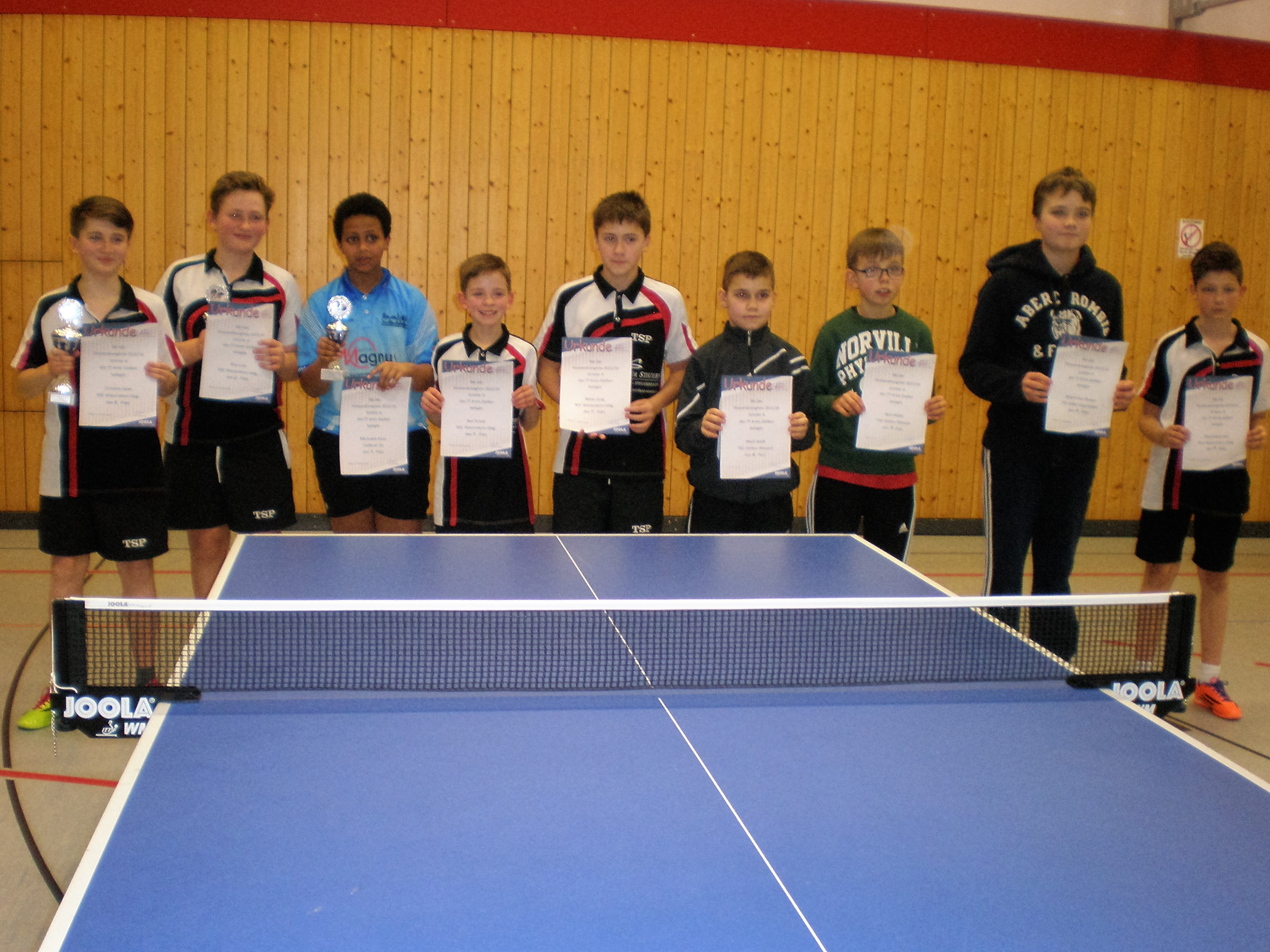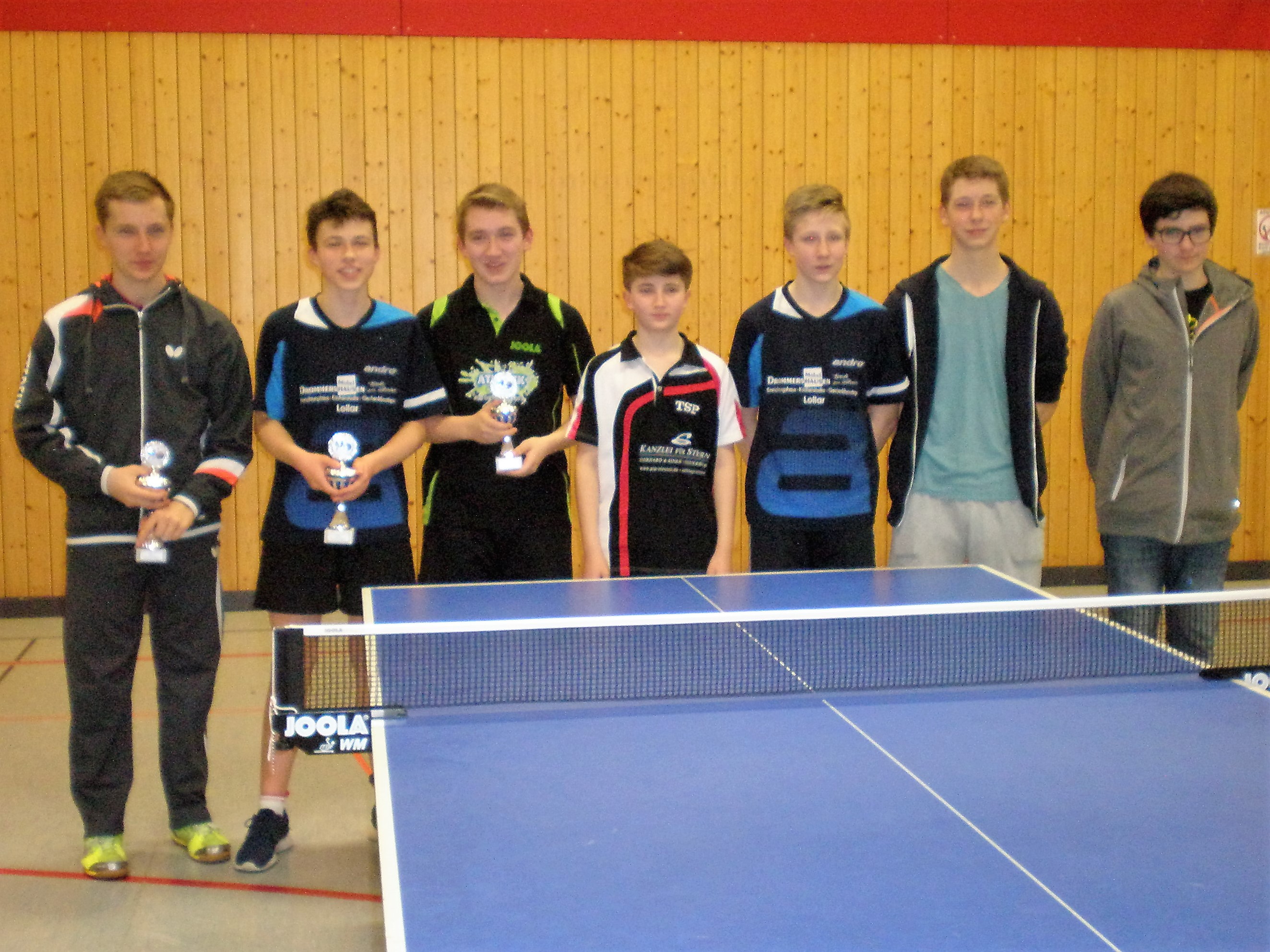 Männliche Jugend (v.l.): 1. Julian Langsdorf (TSV Klein-Linden), 2. Timo Geier (TTC Wißmar), 3. Michel Seibert (TTC Wißmar), 4. Christian Spee (NSC W.-Steinberg), 7. Simon Bogner (TTC Wißmar), 8. Bastian Swoboda (VfB Ruppertsburg), 9. Simon Gebauer (VfB Ruppertsburg). Nicht im Bild: 5. Josua Monden (TSF Heuchelheim), 6. Elias Monden (TSF Heuchelheim).