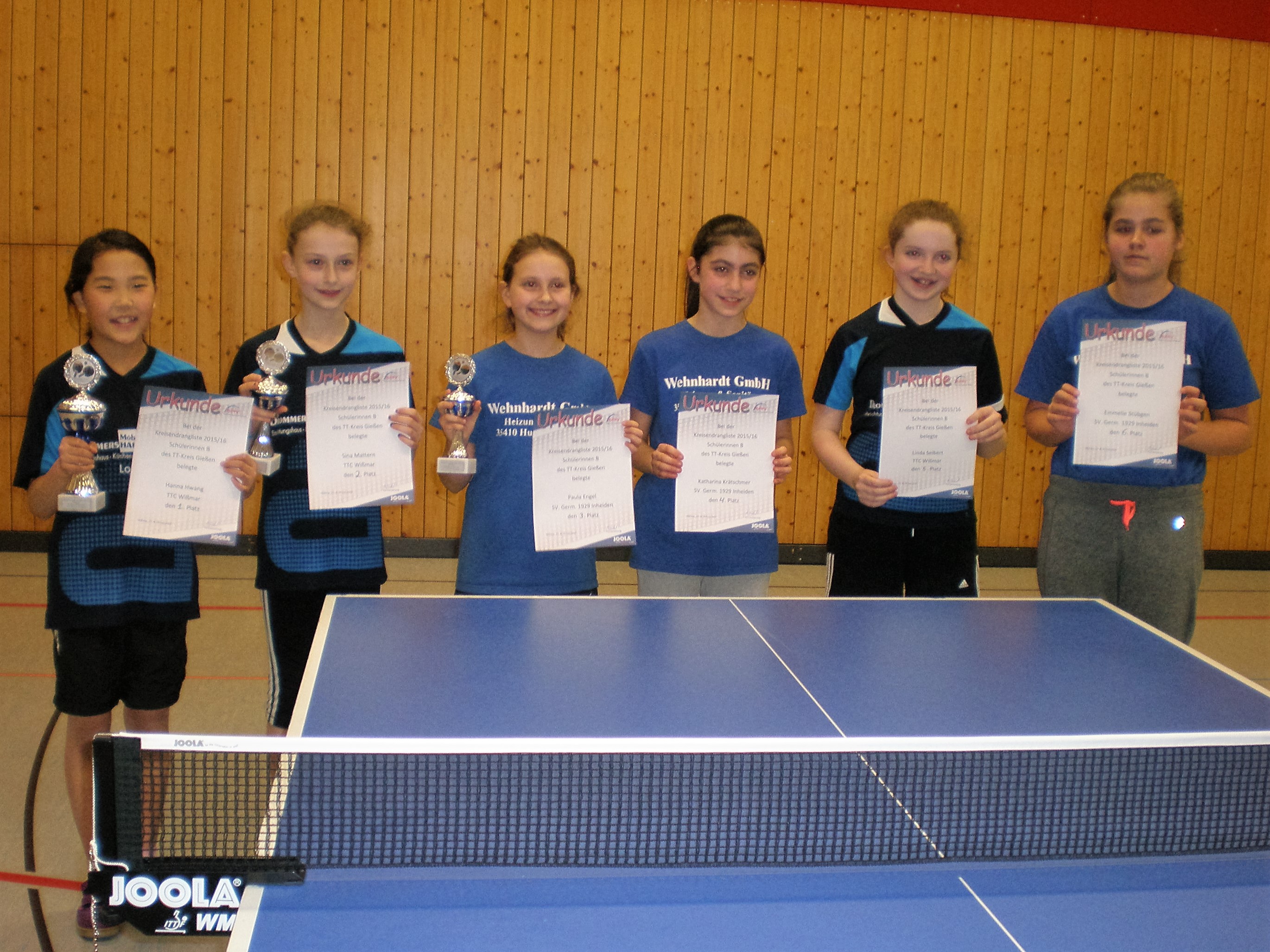 Schülerinnen B (v.l.): 1. Hanna Hwang (TTC Wißmar), 2. Sina Mattern (TTC Wißmar), 3. Paula Engel (SV Inheiden), 4. Katharina Krätschmer (SV Inheiden), 5. Linda Seibert (TTC Wißmar), 6. Emmelie Stübgen (SV Inheiden).