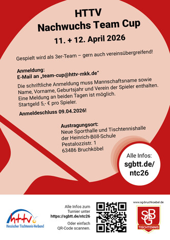 Der diesjährige HTTV Nachwuchs Team-Cup findet am 11. + 12. April 2026 erstmalig in Bruchköbel statt. Die SG Bruchköbel 1868 und der Main-Kinzig-Kreis freuen sich auf zahlreiche Teams und Spieler. Alle Informationen entnehmt bitte der Ausschreibung / Einladung.