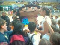 Auch der Hessische Tischtennis-Verband ist bei "RheinMain Sport aktiv" vom 23. bis 26. Juni 2004 im Osten von Frankfurt gegenüber dem Ostpark in der Nähe der Kaiserleibrücke präsent. Heute waren die Klassen eins bis vier in der Eissporthalle (Foto mit dem Maskottchen). Morgen sollen es bei den fünften bis neunten Klassen über 2.000 werden. Wegen diesen großen Andrangs wurden aus der Landessportschule am Mittwochnachmittag noch weitere TT-Tische geholt.