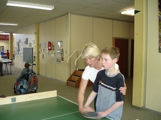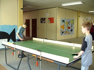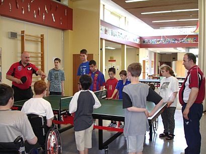 Zu Beginn der Woche lernen die Schüler von Herrn Marschall (Landestrainer für Tischtennis beim HBRS, die richtige Schlägerhaltung beim Tischtennis kennen und entwickeln durch kleine Übungen ein Gefühl für den Schläger und den Ball. Schon nach kurzer Zeit gelingt es den meisten Schülern sich den Ball über das Netz zuzuspielen und die Schüler sind stolz auf dieses Ergebnis. Einige haben Schwierigkeiten mit der Auge-Hand-Koordination und wenden sich lieber dem Spiel "Polybat" zu. Dabei handelt es sich um ein alternatives Tischtennisspiel für (Körper-) Behinderte. Das Spiel wird auf einem Tischtennistisch ohne Netz durchgeführt, deren Längsseiten mit einer ca. 10 cm hohen Bande versehen sind. Die Schläger sind rechteckig und besitzen einen Griff. Mit diesen Schlägern wird ein Ball hin und her geschlagen. Ziel ist es, den Ball über die Stirnseite des Gegenspielers zu befördern. Schnell zeigt sich, dass es sich bei Polybat um ein attraktives Spiel handelt, welches Schüler mit unterschiedlichen motorischen Voraussetzungen gemeinsam spielen können.