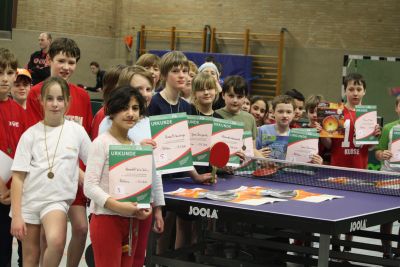 In den letzten Monaten scheinen die Kinder in der AG viel gelernt und mitgenommen zu haben. Viele von ihnen konnten ihr frisch erworbenes Können bei den sogenannten mini-Meisterschaften des Deutschen Tischtennisbundes, einem Turnier der unter 12-jährigen, unter Beweis stellen. Der Startschuss fiel am 09.Februar 2010 beim sogenannten Ortsentscheid, den Pohlheimer Stadtmeisterschaften für die Minis. Mit fast 40 Teilnehmer/innen in den drei verschiedenen Altersklassen der Mädchen und Jungen war die Pohlheimer Veranstaltung die zweitgrößte im Landkreis Gießen. Die jeweils besten vier Mädchen und Jungen qualifizierten sich für die nächste Ebene, den Kreisentscheid Gießen, der in Klein-Linden am 21.März ausgetragen wurde. 21 Pohlheimer Kinder hatten sich für Klein-Linden ein Startrecht erspielt. Fünf von ihnen - Selina Bredemeier, Roxana Przondzion, Annabell Julia Sahin, Carl Moritz Jung, Tom Jost - gelang durch tolle Leistungen der Sprung auf das Treppchen und zum Bezirksfinale in Höchst/Nidder. Bei insgesamt mehr als 100 Minis in Klein-Linden ein hervorragendes Ergebnis.