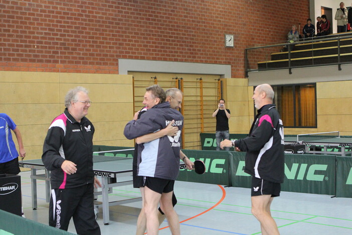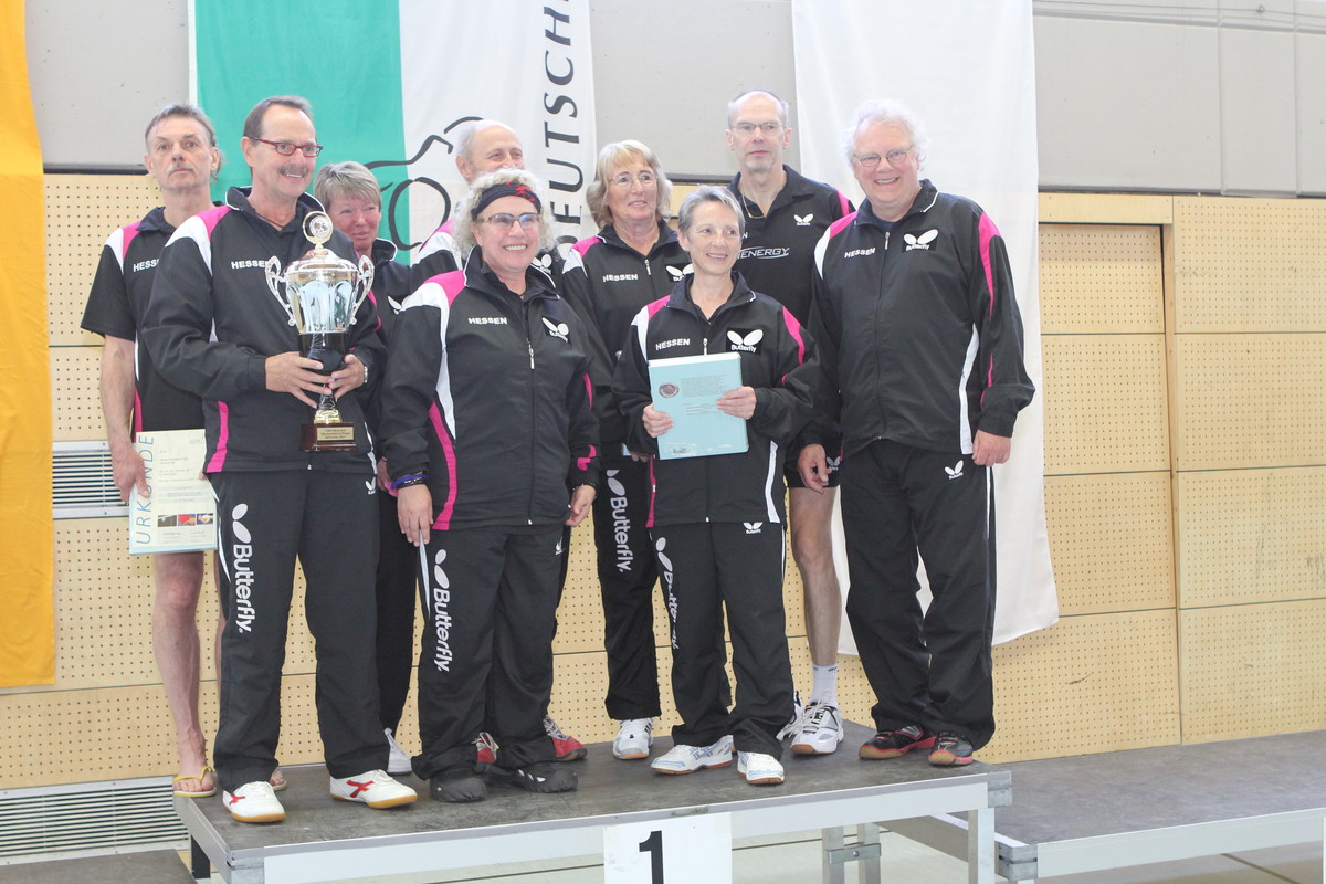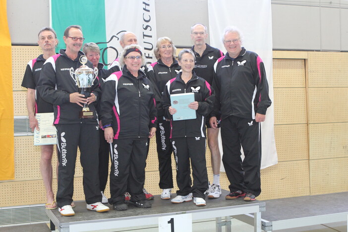 Die Herrenmannschaft der hessischen Tischtennis-Senioren (Altersklasse 60+) gewann am Wochenende den Deutschlandpokal. Bei dem Mannschaftsturnier in Neuhausen bei Stuttgart siegten die Herren des Hessischen Tischtennisverbands (HTTV) im Finale gegen die favorisierte Mannschaft vom Tischtennisverband Schleswig-Holstein. Gleichzeitig gewann die hessische Damenmannschaft das Spiel um Platz 3. Mit dem Sieg der Herren und dem hervorragenden dritten Platz der Damen gewannen die Mannschaften des HTTV ebenfalls die Teamwertung des Turniers.
