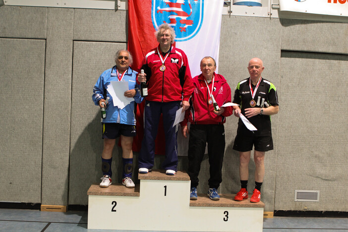 Im Doppel konnten sich in der 70er - Klasse Joachim Warlies (TV Kubach) und Karlheinz Schmitz (TTC Richelsdorf) durchsetzen, die letztes Jahr den Titel in der Klasse Ü65 gewannen. Eine Überraschung gab es in der Klasse Ü75 - hier konnten sich Berthold Peschke (SC Waldgirmes) und Otto Jung (TV 08 Aßlar) gegen Hans Sehring und Winfried Simonowsky (TTC Langen) durchsetzen. Das Langener Duo gewann sein Halbfinale gegen die Top-Gesetzten Hartmut Schnell und Erhard Landenfeld nach 0:2 Rückstand im Entscheidungssatz in der Verlängerung. In der Klasse Ü80 setzten sich die Abonnementsmeister Dr. Hanskarl Emmerich (SVH Kassel) an der Seite von Friedrich Rössler (Tura Niederhöchstadt) gegen Otto Rau (Topspin Lorsch) und Alfred Hövels (TV 08 Aßlar) durch.