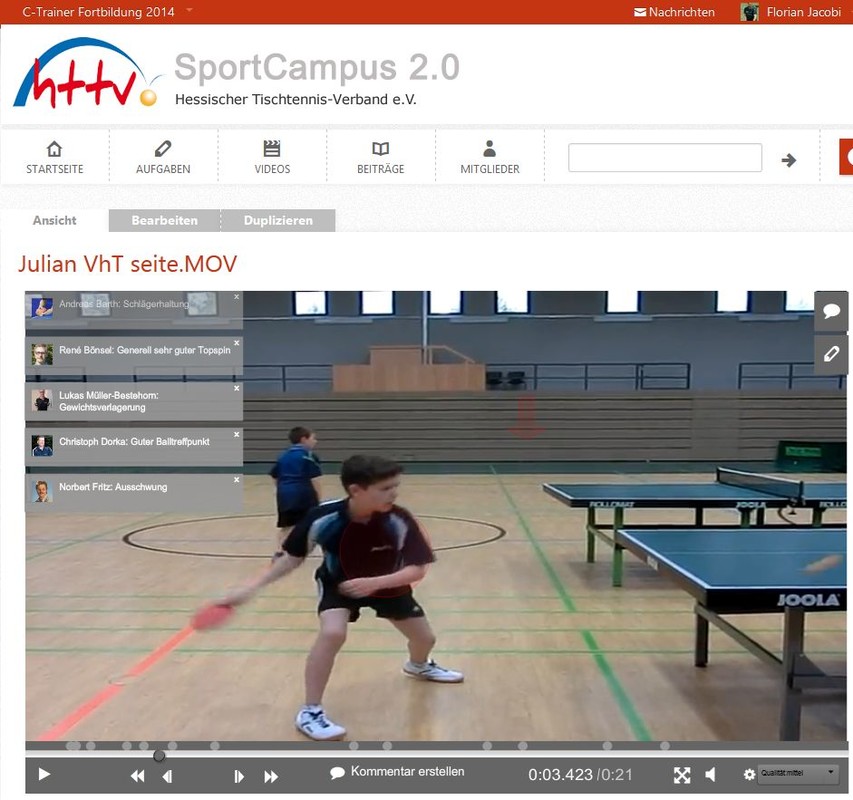 Das Verhältnis der Teilnehmer untereinander und der beteiligten Dozenten empfand ich als sehr angenehm und konstruktiv. Deutlich fokussierter auf die Lerninhalte als in anderen Fortbildungen. Ich hatte während der Onlinephasen und des Präsenztages selten das Gefühl „oh, jetzt verschenke ich meine Zeit“. Spätestens bei der Reflexion der Kommentierungen von Kollegen ging erneut das Grübeln über die eigene Wahrnehmung von Technik und den überlegten Korrekturmöglichkeiten los. Spannend war zu lesen, wie andere Trainer Technik ähnlich oder identisch bewerten, aber wie unterschiedlich die Schwerpunkte bei der Korrektur ausfallen können.
