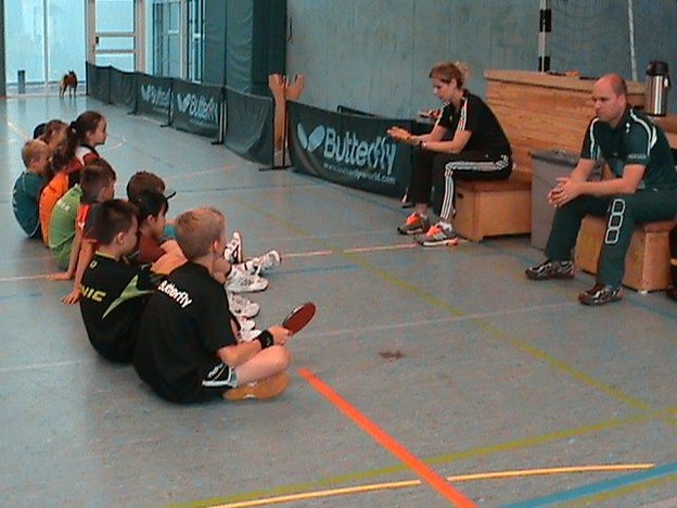 Danach wurde unter der Anleitung von Elke Schall-Süß die verschiedene Bein- und Schlagtechniken über den Einsatz von Schattentraining in jeder Trainingseinheit intensiv geschult und immer wieder neu gefestigt. Es wurde fleißig an Körperöffnungen und rationellen Beinarbeitstechniken in die Vorhand-Ecke gefeilt, ständige Gewichtsverlagerungen abverlangt und Schlagtechniken zielgerichtet optimiert. Von den Trainern wurde Kritik und Lob gerecht verteilt um die Kinder zum weiteren schnellen Lernen zu motivieren.
