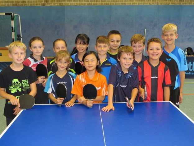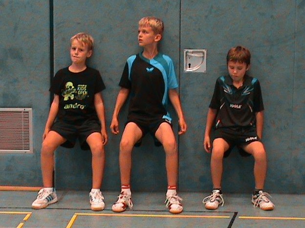 Eine wichtige Beinarbeitsübung im Gruppentraining war die „Spezialübung“ 1x Block in VH-Ecke, 1x Block in Mitte. Darauf sollte man jeweils den ersten Durchgang mit VH-Spin den Ball in der Nähe des Tisches treffen und danach sich etwas vom Tisch zurückbewegen. Im 2. Durchgang sollte der Ball dann etwas vom Tisch entfernt getroffen und im etwas höheren Bogen zurückgespielt werden. Diese Vor-Zurück-Vor-Übung inklusive seitlicher Beinarbeit ließ den Kindern keine Zeit sich auf der Stelle „auszuruhen“ und sollte zukünftig in fast jeder Trainingseinheit mit unterschiedlichem Schlagtempo durchgeführt werden.