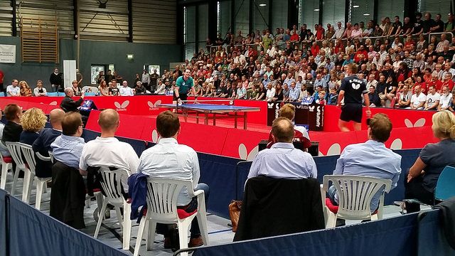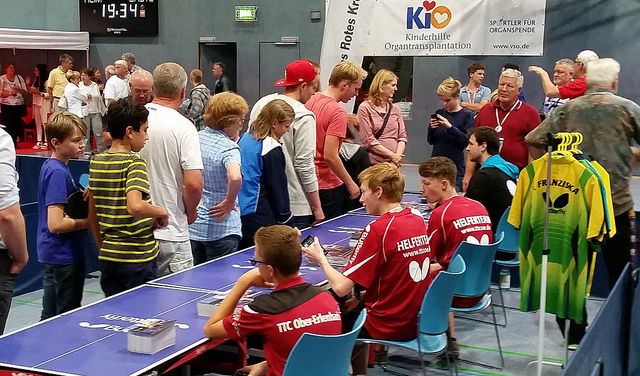 Der Parkplatz im Wingert-Park reichte bei weitem nicht aus. Auf der Haupttraße und in der Nachbarschaft standen die Fahrzeuge. Noch nie waren so viele - nämlich 530 Zuschauer - in dieser Sporthalle. Das Zugpferd, die ehemalige Nr. 1 im Welt-Tischtennis zog. Doch leider war der sympathische Hesse sehr krank und konnte sein Können am TT-Tisch nicht zeigen. Trotzdem war er da, um seinen zahlreichen Fans wenigstens mit einem Autogramm und/oder einem Selfie behilflich zu sein. Der Silbermedaillengewinner der Olympischen Spiele hat auch seine nächsten Turniere absagen müssen und kuriert sich nun erst einmal in seiner Heimat Höchst im Odenwald aus. Alle Zuschauer und der TTC OE als Gastgeber der Benefiz-Gala wünschten ihm dazu gestern eine schnelle Genesung. Kein einziger "Buhruf" oder Pfiff war zu hören. An dieser Stelle auch nochmals herzlichen Dank für den respektvollen Umgang mit dem kranken TT-Star an unser tolles Publikum. Sie bekamen großartigen Sport, sensationelle Ballwechsel und einige amüsante Show-Einlagen geliefert von den anderen vier Akteuren.