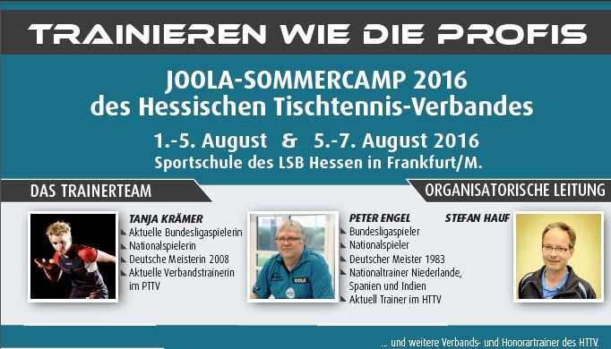 Auch im kommenden Jahr bietet der Hessische Tischtennis-Verband zwei Veranstaltungen in der Landessportschule Frankfurt an. Das 5-Tagescamp findet vom 1.-5. August 2016 statt. Alternativ gibt es einen Wochenendlehrgang vom 5.-7. August.