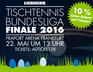 Mit dem Osterspecial erhalten Sie bis Montag, 28. März 2016, 10 % Rabatt auf alle Ticket-Kategorien (ausgenommen VIP)! Dazu einfach an entsprechender Stelle im Online-Bestellvorgang den Promo-Code Osterhase in das Feld ‚Passwort‘ eintragen, vom speziellen Oster-Rabatt profitieren und am 22. Mai in der Frankfurter Fraport Arena Tischtennis der Extraklasse zum Sonderpreis erleben!