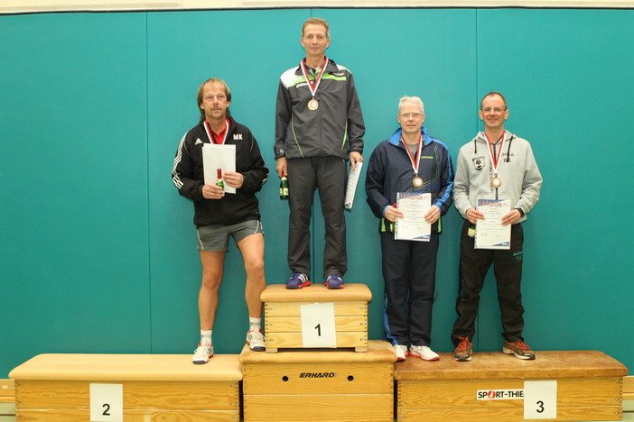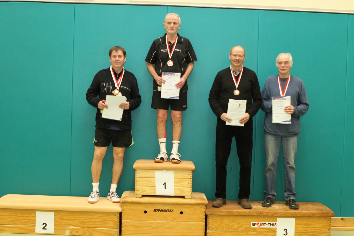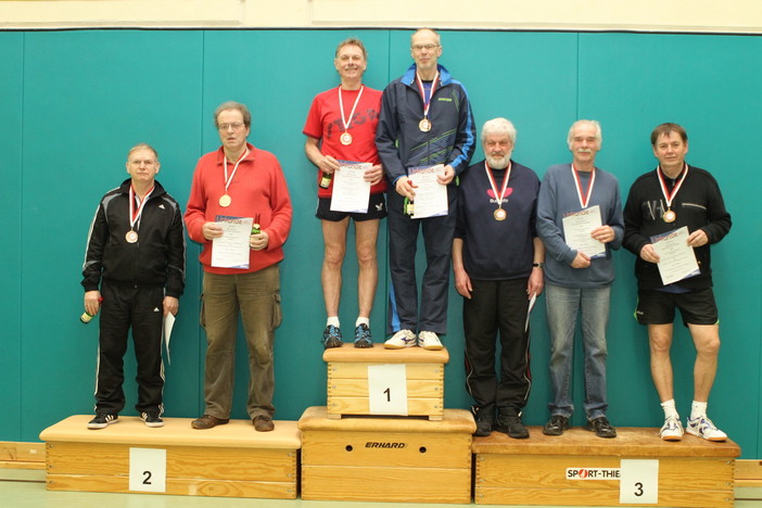 Ab 13:00 Uhr griffen dann die Senioren 65 ins Geschehen ein. In dieser Altersklassen waren die Spieler Dieter Holzapfel (TG Unterliederbach), Hans Joachim Clara (TTC Heppenheim) und Manfred Schlicht (TTV Burgholzhausen-Köppern) im Einzel nicht startberechtigt, da sie, aufgrund ihrer Platzierung bei den Deutschen Meisterschaften im letzten Jahr, für die diesjährigen Deutschen Meisterschaften vornominiert waren. Die 21 Starter wurden in 7 Gruppen eingeteilt. In dieser Altersklasse haben sechs der sieben als Gruppenkopf gesetzten Spieler die KO-Endrunde erreicht. Peter Eucker konnte, wegen einer Verletzung, seiner Setzposition nicht gerecht werden. Ausser den an Position eins und zwei gesetzten Wilfried Weigel (TTC Herbornseelbach) und Jürgen Ernst (SC Eintracht Oberursel) erreichten noch Manfred Werner (TSV Wenigenhasungen) und Bernd Möhring (TG Unterliederbach) das Halbfinale. Im Gegensatz zu Jürgen Ernst, der sein Halbfinale erst im fünften Satz für sich entscheiden konnte, marschierte Wilfried Weigel mit klaren Siegen in Finale. Auch in diesem Finale setzte sich Weigel mit nach einem kleinen Zwischentief, 3:1 gegen Ernst durch und verteidigte damit seine Titel aus dem letzten Jahr.
