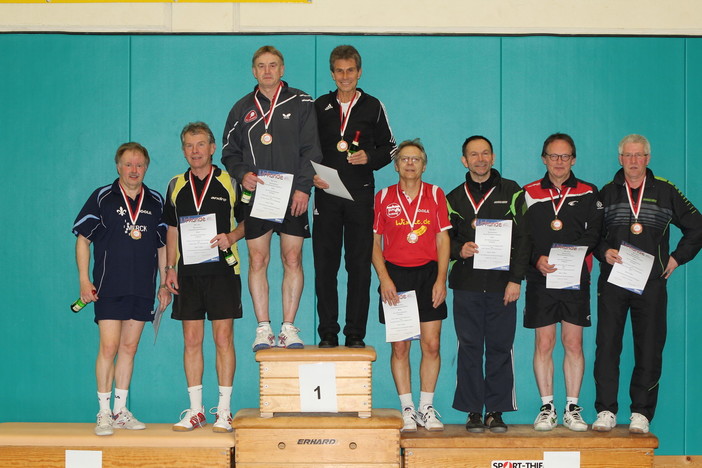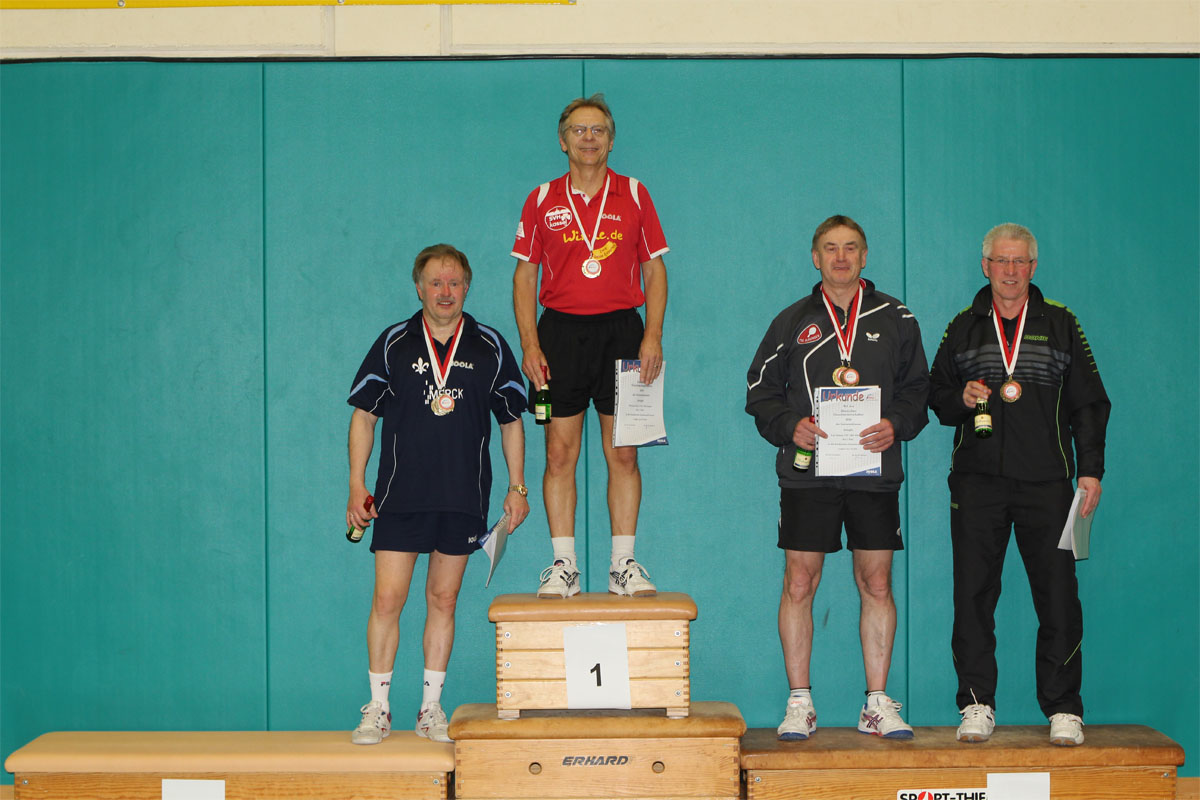 Bei den Senioren 60 konnten in sieben Gruppen die Gruppensieger und –zweiten ermittelt werden, die dann die KO-Runde ausspielten. In dieser Altersklasse setzten sich alle sieben Top-Gesetzten als Gruppenersten durch. Die an Position 1 und 2 gesetzten kamen durch ein Freilos direkt ins Viertelfinale. Bis auf zwei Spiele (Werner Englisch gegen Reinhold Maisch und Peter Krebs gegen Hans Werner Büchler – jeweils 3:2 für Englisch und Krebs), gingen alle Spiele relativ glatt an die Favoriten. Die Halbfinale erreichten mit klaren Siegen Karl Simon (TSV Albungen), Dr. Thomas Luck (SVH Kassel), Werner Englisch (TTC Elz) und Peter Krebs (SV Darmstadt 98). In diesen beiden Spielen ging es schon enger und spannender zu; denn sowohl Luck als auch Krebs konnten sich lediglich im fünften Satz gegen Simon und Englisch durchsetzen. Das Finale war dann wieder eine klare Sache – mit einem 3:0 gewann Dr. Thomas Luck dieses gegen Peter Krebs.