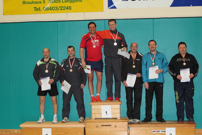 Die Zuschauer konnten ab 10 Uhr die zum größten Teil attraktiven und vor allen Dingen auch spannende Spiele der Seniorinnen/Senioren 40 beoabachten und auch bestaunen. So setzten sich fünf der acht Topgesetzten Spieler auch als Gruppensieger durch; die drei anderen Topgesetzten belegten in ihren Gruppen jeweils den 2. Platz. Bei den Seniorinnen waren es sogar die vier Topgesetzten, die als Gruppensiegerinnen ins KO-System übernommen wurden. Die Achtelfinalspiele bei den Senioren verliefen, bis auf zwei Spiele, doch relativ glatt für die jeweiligen Favoriten. Die Spiele Thomas Schuh gegen Alexander Weiß und Stefan Englich gegen Marc Müller mussten im 5. Satz entschieden werden. Am Ende die glücklicheren waren Alexander Weiß und Marc Müller. Normalerweise hätte man davon ausgehen können, dass von Runde zu Runde die Spiele immer enger würden, doch weit gefehlt. Die Viertelfinalspiele gingen mit jeweils 3:0 Sätzen an Piotr Frackowiak (TTC Elz), Frank Hiebsch (TuS Nordenstadt), Marc Müller (TSV Nieder-Ramstadt) und Wolfgang Dörner (SV Viktoria Preußen). Das Endspiel erreichten Piotr Frackowiak, der sich mit 3:0 Sätzen gegen Frank Hiebsch durchsetzte und Wolfang Dörner, der Marc Müller keine Chance bei seinem 3:0 Sieg über Marc Müller. Im Endspiel hatte jeder gedacht, dass es nach dem 2:0 Zwischenstand für Wolfgang Dörner eine klare Sache für ihn sein würde – doch weit gefehlt – Frackowiak kämpfte sich zurück und holte sich die Sätze 2 – 5 und gewann, am Ende verdient, mit 3:2 Sätzen