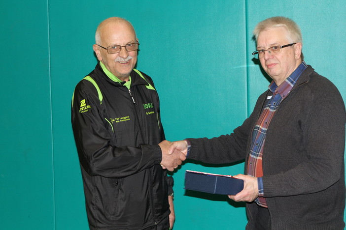 Hier das Bild von der Übergabe des Gastgeschenkes vom HTTV an Bernd Gewiese vom TSV Langgöns für die gute Durchführung der diesjährigen Hessischen Meisterschaften der Senioren