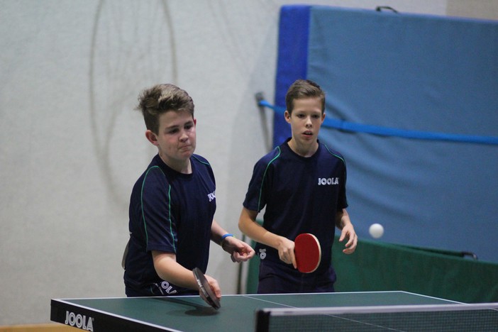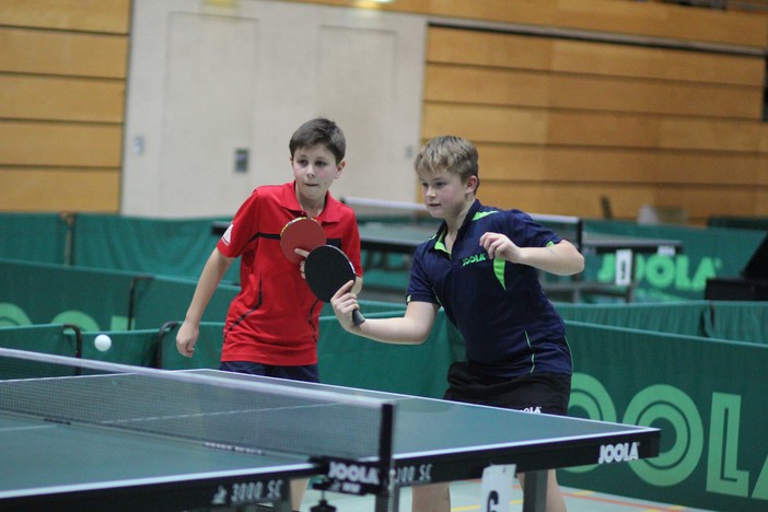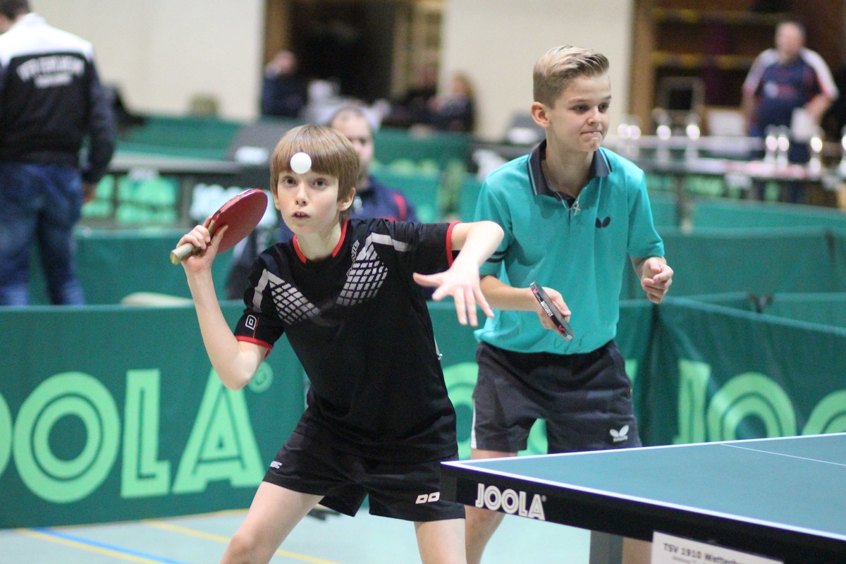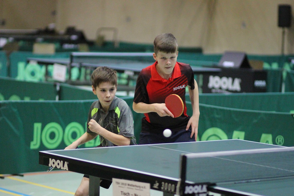 Im Einzel standen sich Tayler Fox/Liam Rauck im Endspiel gegenüber. Nun spielten sie zusammen und schienen auch im Doppel einen überlegenen Erfolg anzusteuern. Durch 3:0-Siege gegen Esben Reichenbach/Max Meinel (Jügesheimer Sport- u. Kulturverein Rodgau e.V/DJK Blau-Weiß Münster), Alessandro Pistara/Philipp Umbach (Eintracht Frankfurt/Sportclub Niestetal) und Matti Krämer/Luis Carnier (DJK Blau-Weiß Münster) standen sie im Finale. Ihre Endspielgegner Bastian Schubert/Alwin Bläser (VfR Fehlheim/TTC Seligenstadt) benötigten in ihrem ersten Spiel gegen Tim Kieselbach/Richard Johannis (TTV Gräfenhausen/Schneppenhausen/Weiterstadt/TG Bornheim) den Entscheidungssatz. Danach schafften sie das Kunststück, die an Vier gesetzten Nils Rau/Christian Schmirler (TTC Königstein/TG Oberjosbach) und die an zwei gesetzten Tyler Köllner/Leon Graf (SVH Kassel/Sportclub Niestetal) zu bezwingen. Im Finale deutete sich eine Überraschung an, als Bastian Schubert/Alwin Bläser den ersten Satz 11:8 gewannen. Tayler Fox/Liam Rauck wurden dann aber immer stärker und gewannen 11:3, 11:9 und 11:4.