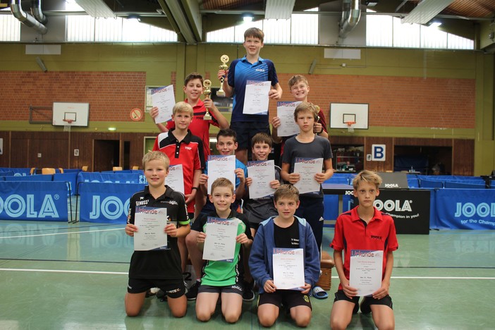 Schüler B: 1. Alwin Bläser (TTC Salmünster) 33:6 Sätze/11:0 Spiele, 2. Leon Graf (SC Niestetal) 30:8/10:1, 3. Tyler Köllner (SVH Kassel) 29:12/9:2, 4. Nils Rau (TTC OE Bad Homburg) 26:19/8:3, 5. Fabian Reimann (SVH Kassel) 23:20/6:5, 6. Justin Uong (TTC OE Bad Homburg) 21:20/5:6, 7. Bastian Schubert (VfR Fehlheim) 20:24/4:7, 8. Richard Johannis (TG Bornheim) 20:27/4:7, 9. Bennet Teppich (TTC RhönSprudel Fulda-Maberzell) 15:22/4:7, 10. Tim Ecker (TSG Sulzbach) 13:29/2:9, 11. Jakob von Dörnberg (TV Roßdorf) 9:29/2:9, 12. Lars-Marian Doleschal (TTC RW Biebrich) 9:32/1:10).