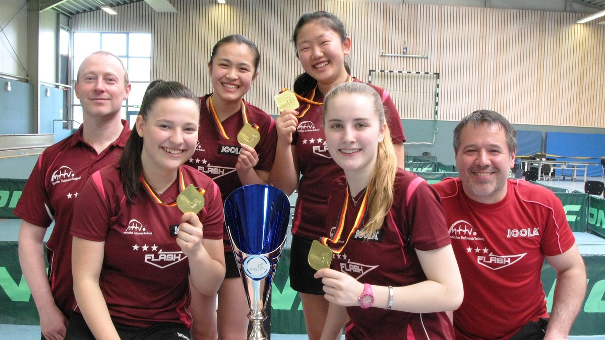 In der Konkurrenz der Mädchen hatte es die HTTV-Auswahl um Sophia Klee, Anastasia Bondareva, Tingzhuo „Tina“ Li und Ayumu Tsutsui in der Vorrunde in Brokstedt mit Schleswig-Holstein, Bayern und dem Team des R.TTV.R zu tun. Dabei musste das Team in der Vorrunde auf die gesundheitlich angeschlagene Sophia Klee verzichten. Doch gleich zu Beginn gegen den R.TTV.R untermauerte die Mannschaft ihre Ambitionen. Ohne Satzverlust gab es einen souveränen 4:0-Erfolg. Mit dem gleichen Ergebnis bezwang das Trio auch die Kombination aus Schleswig-Holstein, wobei am Ende fünf Satzverluste zu verzeichnen waren. Im abschließenden Gruppenspiel gegen Bayern stand der Gruppensieg bereits fest, eine konzentrierte Leistung führte am Ende zu einem 4:1-Sieg. So stand am Ende mit 6:0 Punkten, 12:0 Spielen und 38:13 Sätzen der souveräne Gruppensieg. Mit dem Eilzug, in dem auch Sophia Klee inzwischen Platz genommen hatte, ging es in Richtung Endspiel. Sowohl für das Team aus Sachsen im Viertelfinale, als auch die Vertretung des Westdeutschen Tischtennis-Verbandes (WTTV) im Halbfinale gab es keinen Punkt zu holen. Gönnte das Team von Tobias Beck und Andrej Bondarev dem Gegner im Viertelfinale keinen Satz, konnte der WTTV in der Vorschlussrunde immerhin deren vier gewinnen. Am 4:0-Sieg änderte dies jedoch nichts. Deutlich enger war dann das Finale mit dem Team des TTBW, die mit Yuki Tsutsui, die Schwester von Ayumu aufboten, die gemeinsam mit Sophia Klee und Anastasia Bondareva im vergangenen Jahr noch den Sieg für Hessen klar machte. Zwar sicherte Anastasia Bondareva mit einem 3:1 gegen Jana Kirner die Führung, die der TTBW durch einen 3:2-Sieg von Yuki Tsutsui gegen Sophia Klee egalisierte und mit einem 3:0-Erfolg von Alexandra Kaufmann gegen Tingzhuo Li in eine Führung umwandelte. Durch einen Fünfsatzsieg von Klee/Bondareva gegen Kaufmann/Kirner war alles wieder offen und Klee mit einem klaren Sieg gegen Kirner und Bondareva gegen Kaufmann (11:9 im Entscheidungssatz) behielten die Nerven. Am Ende stand die vielumjubelte Titelverteidigung der Mädchen.