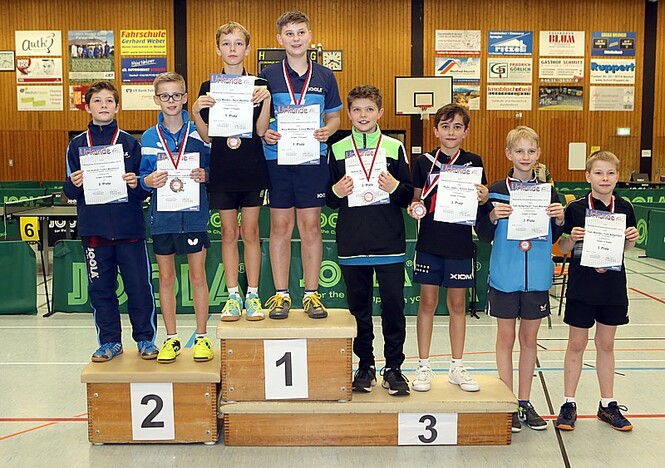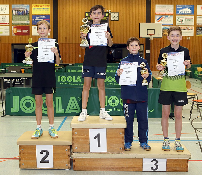 Ryan Jager (Neuenhainer TTV) gab im KO-Feld bis zum Endspiel keinen Satz ab. Sein Gegenüber, Linus Merten (VfR Fehlheim), hatte das Finale durch ein 3:0 und zweimal 3:1 erreicht. Vorentscheidend für den Erfolg von Ryan Jager war wohl der erste Satz, als er bereits 7:10 zurücklag und dann noch 12:10 gewann. Zweimal gelang es Linus Merten einen Satzrückstand auszugleichen. Nach einigen sehenswerten Ballwechseln gewann Ryan Jager am Ende durch ein 11:5 im entscheidenden Durchgang.
