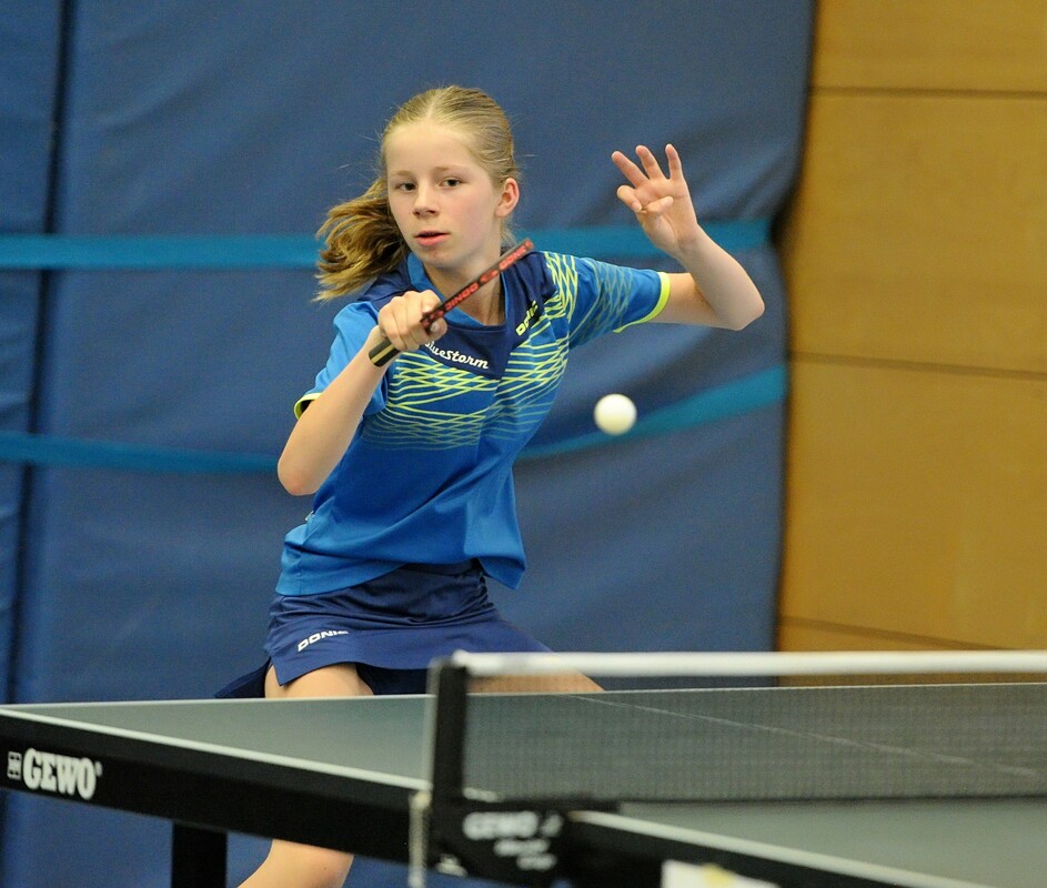 Auch bei den Mädchen war es bis zum Ende eng und umkämpft. Man hatte, den TTR- und QTTR-Werten folgend, Amelie Guzi Jia, Kira Aeberhard und die an Position eins gesetzte Sophie Krießbach ganz vorne erwartet. Sophie Krießbach, die eine 8:1-Bilanz in der Endrunde verbuchte, konnte ihre Langstädter Vereinskollegin Amelie Jia auf den dritten Platz verweisen, auch wenn sie gegen Jia ihre einzige Niederlage im Turnier mit einem knappen 2:3 hinnehmen musste. Ansonsten gewann die 13-jährige Krießbach ihre Matches alle relativ ungefährdet mit 3:0 oder 3:1. Rang zwei ging an Kira Aeberhard von den TTF Oberzeuzheim. Aeberhard und Jia waren in der Endabrechnung mit jeweils sieben Siegen und zwei Niederlagen notiert. Mit vier Teilnehmerinnen an der Endrunde war der südhessische TTC Langen im oberen Segment am stärksten vertreten. Für einen der vorderen Plätze reichte es aber nicht, als Beste musste Patricia Bresic mit Rang fünf Vorlieb nehmen. Im Gruppenspiel gelang der Langenerin Aleena Khan, am Ende nur Zehnte des Turniers, mit ihrem 3:1-Erfolg über Amelie Jia indes eine faustdicke Überraschung.