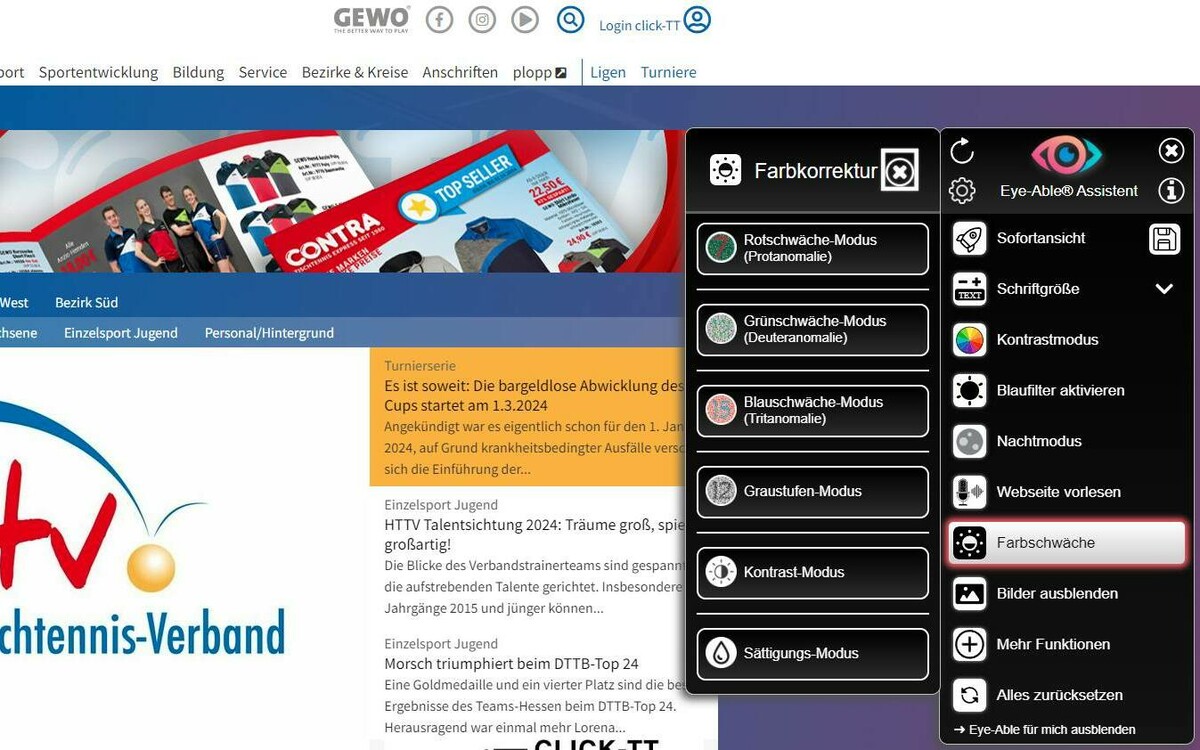 Der Hessische Tischtennisverband bietet auf seiner Homepage www.httv.de einen neuen Service an. Dank einer integrierten Assistenzsoftware können alle die Optik der Inhalte auf ihre individuellen Bedürfnisse anpassen. Es stehen viele Funktionen bereit – beispielsweise: