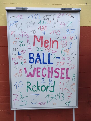 Das Highlight des Tages war der Wettbewerb: „Wer schafft den längsten Ballwechsel“? Dabei konnten sich die Kinder aussuchen, ob sie dies mit einer unserer Trainerinnen, einem Freund/einer Freundin oder der Familie versuchen wollten. Im Anschluss wurde der Rekord dann auf unserer Aktionstafel aufgeschrieben. Beachtenswert war hierbei, dass ein Kind über 600 Ballwechsel mit einer Trainerin schaffte. Dieses Kind hatte vorher keinerlei Erfahrungen mit dieser Sportart. Auch einiger unserer Jugendspieler waren zur Unterstützung dabei. Vor allem am Rundlauftisch kam Freude beim gemeinsamen Spielen auf. Am Aufschlagtisch konnten sich vor allem die kleineren Kinder erproben. Wer trifft mit einem Aufschlag einen Becher auf dem Tisch? Mit etwas Glück gab es hier sogar etwas zu gewinnen!