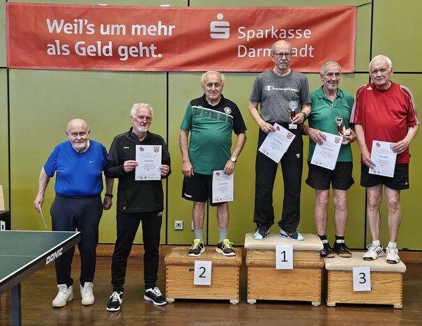 Obwohl in der Seniorenklasse acht Spieler angemeldet waren, wurde auch hier, auf Wunsch der Spieler, "Jeder gegen Jeden", also sieben Runden, gespielt. Allerdings einigte man sich hier auf zwei Gewinnsätze. Nach fast drei Stunden Spielzeit standen die Sieger fest: Stadtmeister 2024 der Senioren wurde Berndt Hoffmann vor Georg Schweipert (2.), beide vom SVS. Den dritten Platz belegte Dominique Jaenesson, auf den weiteren Plätzen folgten Alfred Harder (4.), Günther Lehmann (5.), Horst Müller (6., alle drei vom TuS Griesheim), Gilles Taguel (7.) und Bernhard Reckers (8.).