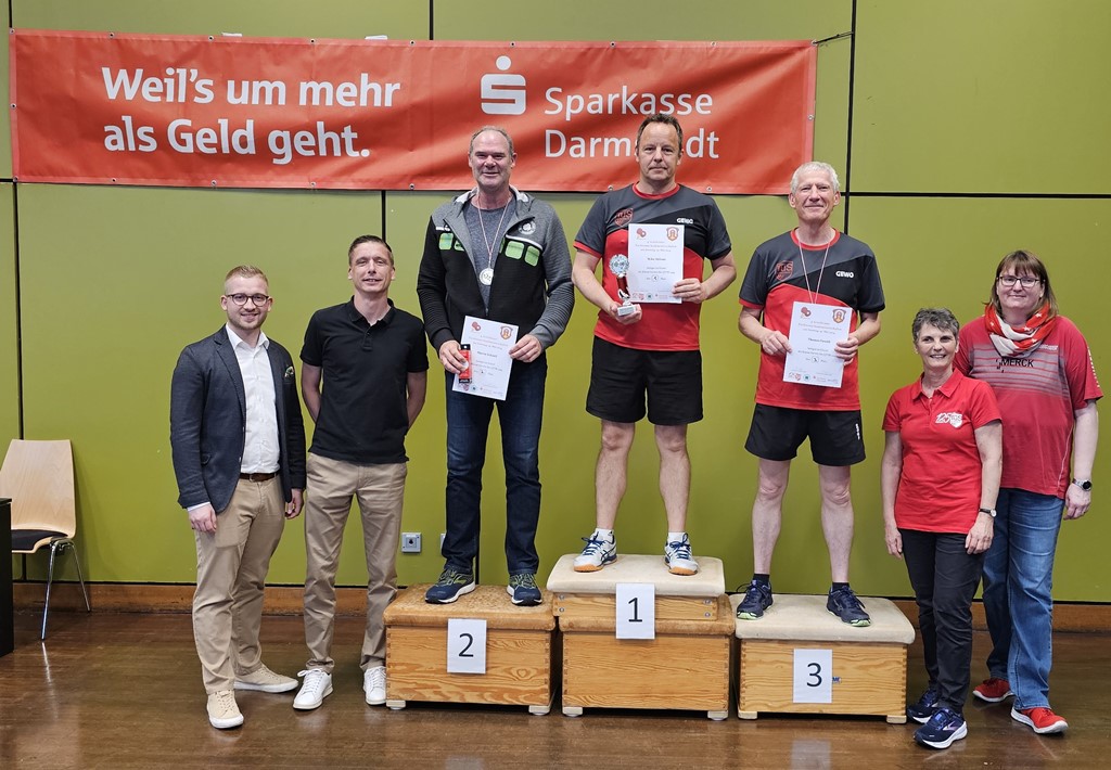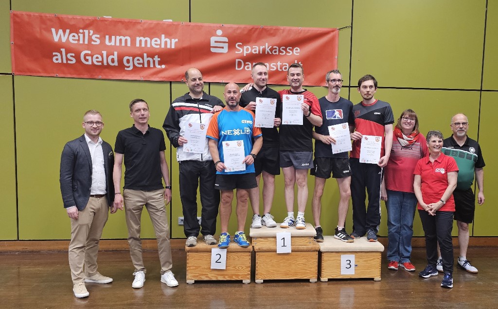 Die drei teilnehmenden Damen des TuS Griesheim, Antje Rieß, Elli Niemann und Martina Weber-Andraschek, entschieden sich, bei den Herren mitzuspielen. Es fanden sich in dieser Klasse 12 Spieler, die auf zwei Gruppen verteilt wurden. So hatte jeder Spieler mindestens fünf Einzelspiele zu bestreiten. Die beiden Erstplatzierten konnten sich direkt für das Halbfinale qualifizieren. Nach spannenden Spielen standen die Platzierungen fest. In der Gruppe 2 musste sogar der direkte Spielvergleich für die Entscheidung des Weiterkommens herangezogen werden. So fanden sich Martin Schnell, Martin Gauder, Mike Hübner und Thomas Fasold in Halbfinale. Ausgeschieden waren dagegen Andreas Eufinger, Elli Niemann, Martina Weber-Andraschek, Antje Rieß, Thomas Keller, Klaus Müller und die beiden Jugendspieler Julian Andraschek und Phillip Götz.