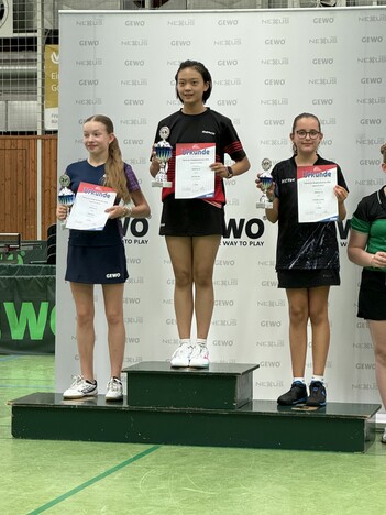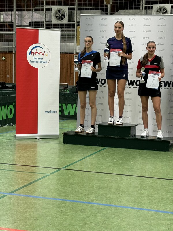 Mila Niu (TTC GW Staffel) wurde ihrer klaren Favoritenstellung bei den Mädchen 13 gerecht. Lediglich drei Sätze in 11 Spielen verlor die Oberligaspielerin im Verlaufe des Turniers. Eng ging es hinter Niu zu. Frida Hainz (TTC Salmünster) wurde Zweite mit Zwei Niederlagen in der Endrunde. Dahinter musste das Satzverhältnis entscheiden. Drei Spielerinnen hatten mit drei Niederlagen das gleiche Spielverhältnis. Das glückliche Ende hatte Pia Kaltenschnee (TV Gedern), die den Sprung auf das Podest schaffte. Platz vier bzw. fünf belegten Trixi Krämer (TTC Langen) und Evie Lok-Si Wong (TV Bad Orb).