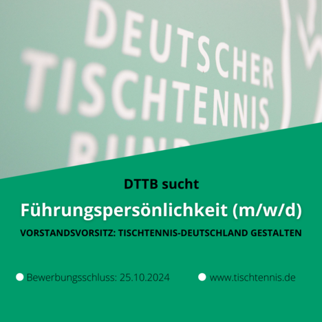Zur Verstärkung seiner Führungsebene sucht der DTTB einen erfahrenen und teamfähigen Vorstandsvorsitzenden (m/w/d). Die gesuchte Person soll die neu geschaffene Strukturveränderung mit Vorstand und Aufsichtsrat, Präsidium genannt, auf Basis der neuen Satzung aktiv umsetzen und mit Leben füllen. Innovative Ideen und deren Umsetzung sind - in Abstimmung mit dem Präsidium und den 18 Mitgliedsverbänden - ein wesentlicher Bestandteil des Anforderungsprofils.