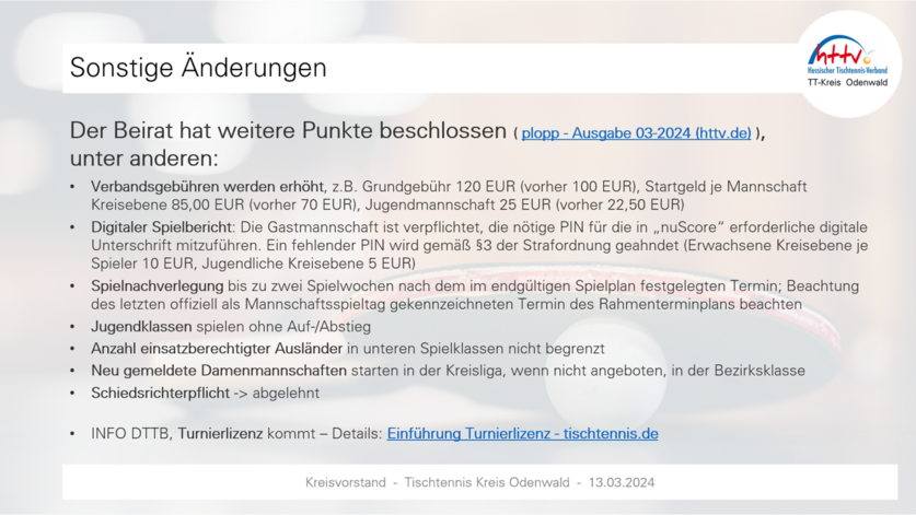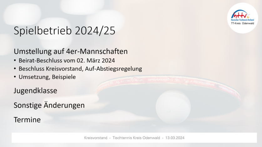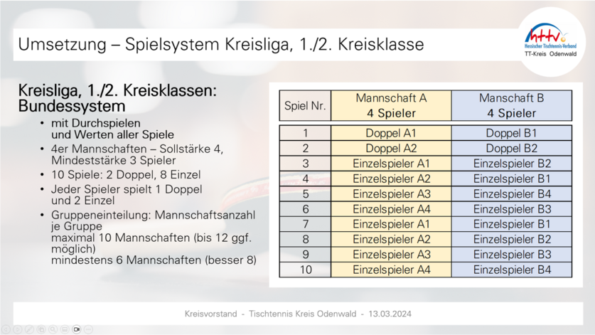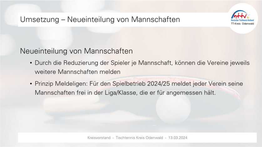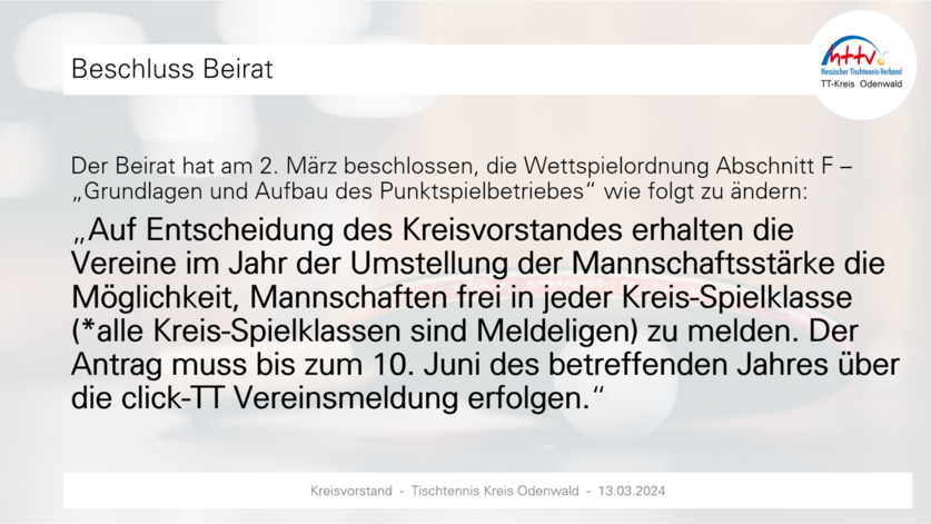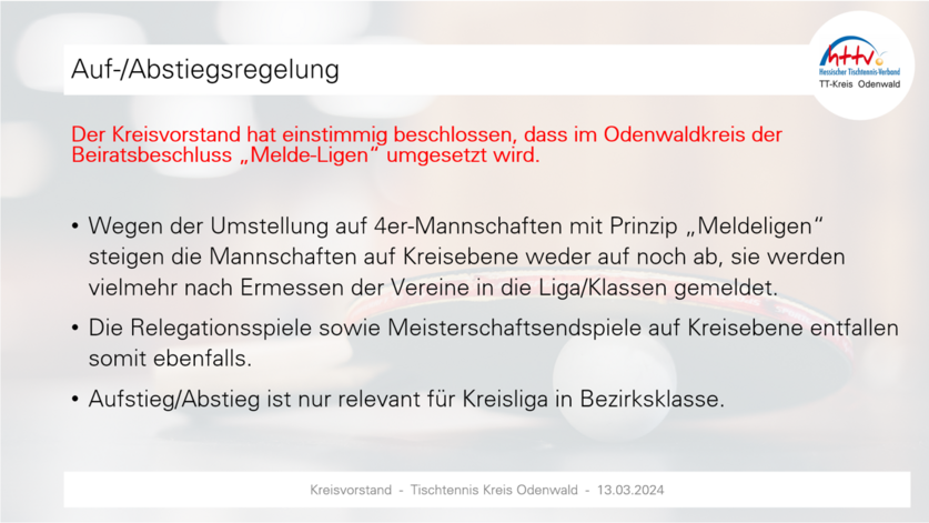 Der Kreisvorstand hat einstimmig beschlossen, dass im Odenwaldkreis der Beiratsbeschluss „Melde-Ligen“ umgesetzt wird (Details vgl. Anlage). Neben grundsätzlichem Verfahren und Auf-/Abstiegsregelung, finden sich in der Unterlage auch Beispiele.Wichtig: Termin Kreistag ist 7. Juni 2024 - 20.00 Uhr in Stockheim (separate Einladung folgt). Der Kreisvorstand bittet darum, die Vereinsmeldungen bis spätestens 05.06.2024 vorzunehmen – nur so kann die (vorläufige) Klasseneinteilung im Rahmen des Kreistags vorgestellt und erörtert werden