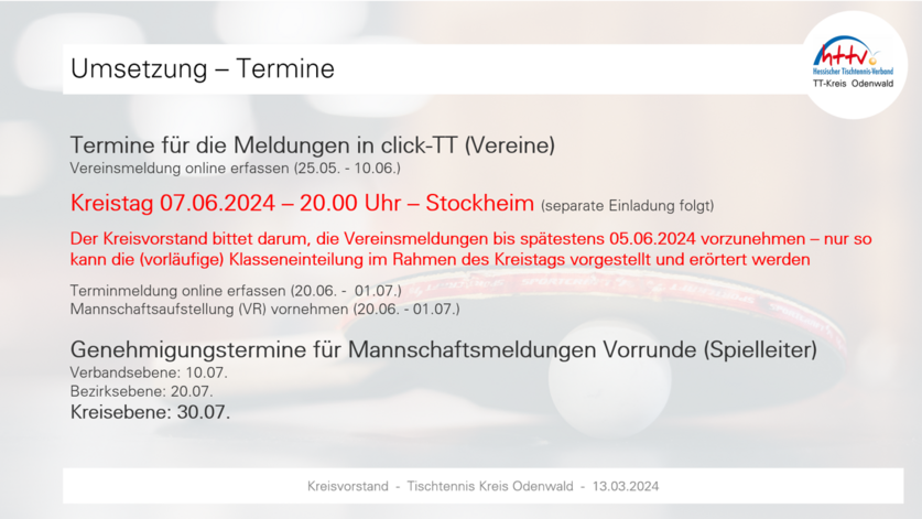 Spielbetrieb 2024/25, Termin Kreistag und Vereinsmeldung