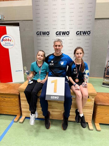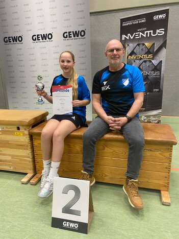 In den Doppelspielen schieden beide Mädchen mit ihren Doppelpartnerinnen bereits in der ersten Runde aus, drehten dann aber in den Gruppenspielen im Einzel mächtig auf. Die 10- jährige Mina schied mit 1:2 Spielen, aber tollen Leistungen als Dritte ihrer Vorrundengruppe aus, während Maike sich mit 2:1 Spielen als Gruppenzweite für die KO Runde qualifizierte. Dort startete sie eine Siegesserie und schlug hintereinander drei Spielerinnen, die alle deutlich höhere Ranglistenwerte vorweisen konnten. Erst im Finale wurde sie von der Top- Favoritin Evie Lok-Si Wong vom TV Bad Orb gestoppt, konnte aber auch hier in allen Sätzen dagegen halten. Der zweite Platz und ein großer Pokal waren der Lohn für eine überragende Turnierleistung.