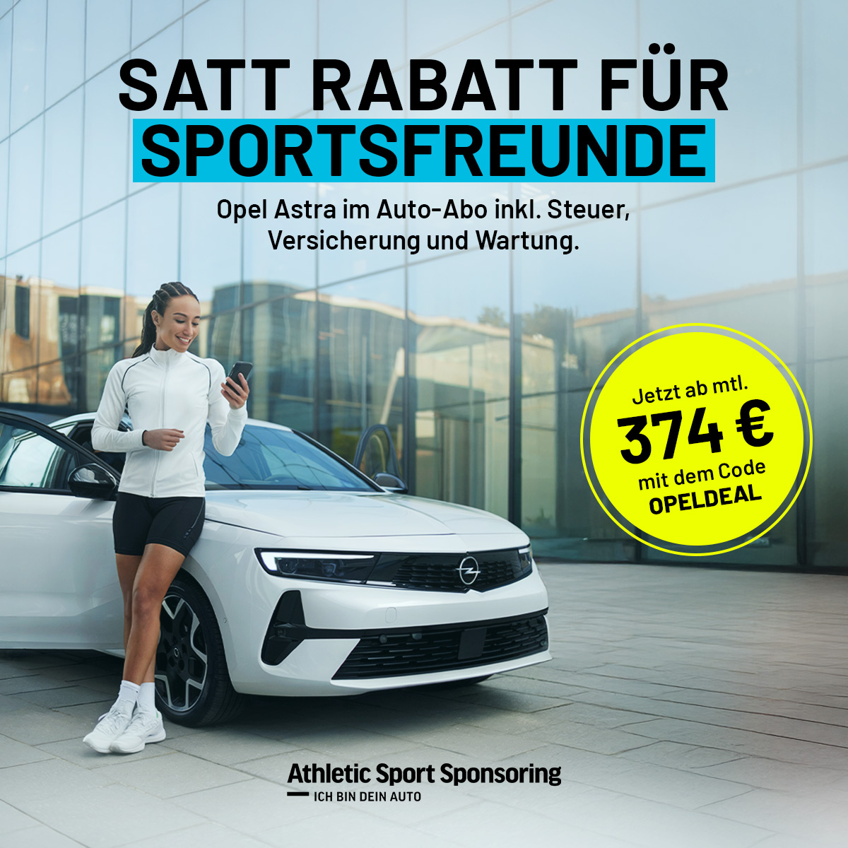 Unser Partner Athletic Sport Sponsoring macht es euch jetzt noch einfacher, unschlagbar preisbewusst im Rundum-sorglos-Paket unterwegs zu sein. Sichert euch jetzt ausgewählte Opel-Modelle zum extragünstigen Preis im Auto-Abo.
