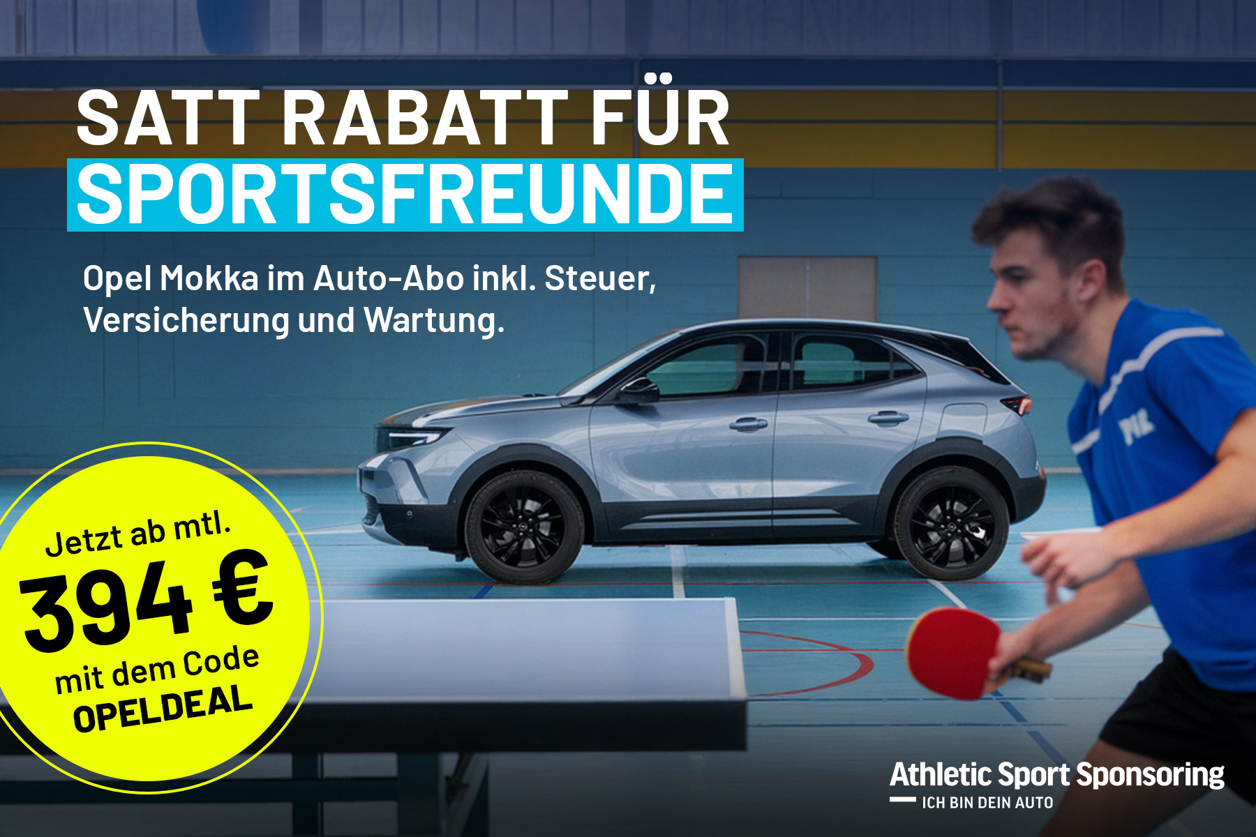 Unser Partner Athletic Sport Sponsoring macht es euch jetzt noch einfacher, unschlagbar preisbewusst im Rundum-sorglos-Paket unterwegs zu sein. Sichert euch jetzt ausgewählte Opel-Modelle zum extragünstigen Preis im Auto-Abo.