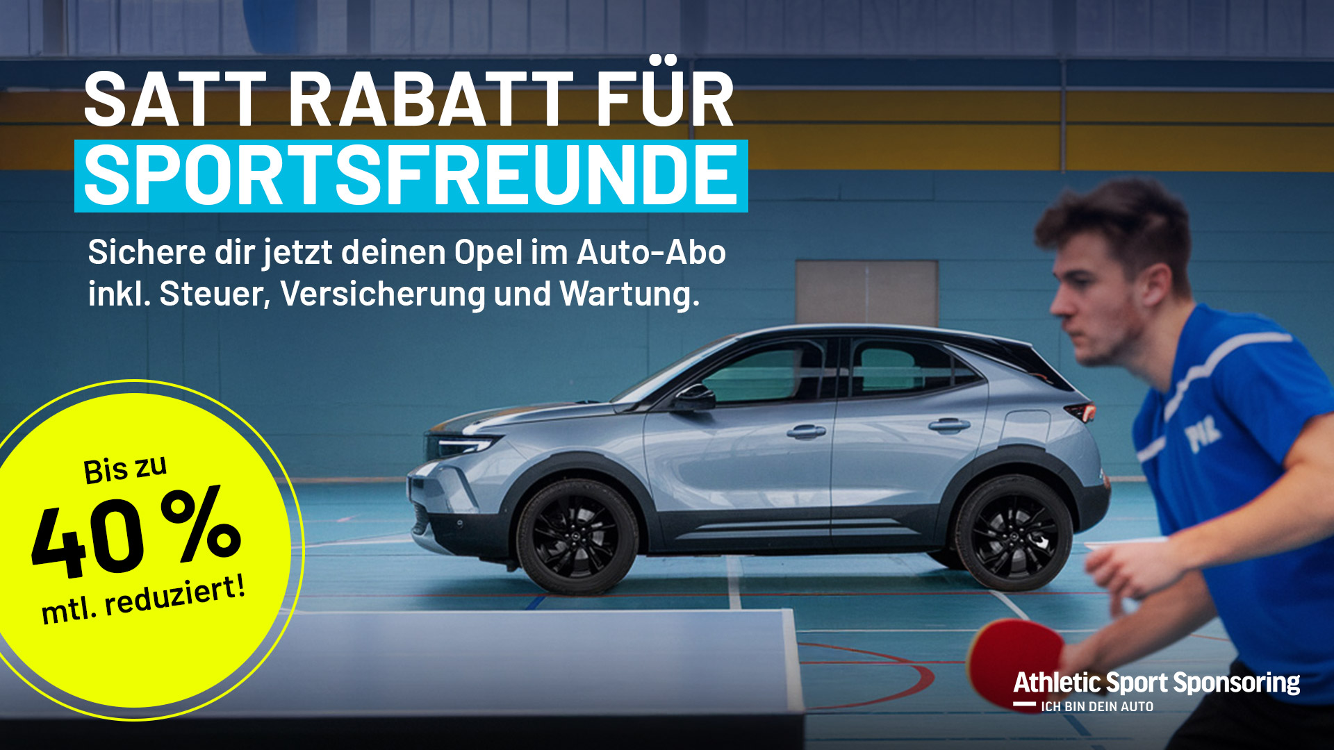 Unser Partner Athletic Sport Sponsoring macht es euch jetzt noch einfacher, unschlagbar preisbewusst im Rundum-sorglos-Paket unterwegs zu sein. Sichert euch jetzt ausgewählte Opel-Modelle zum extragünstigen Preis im Auto-Abo.