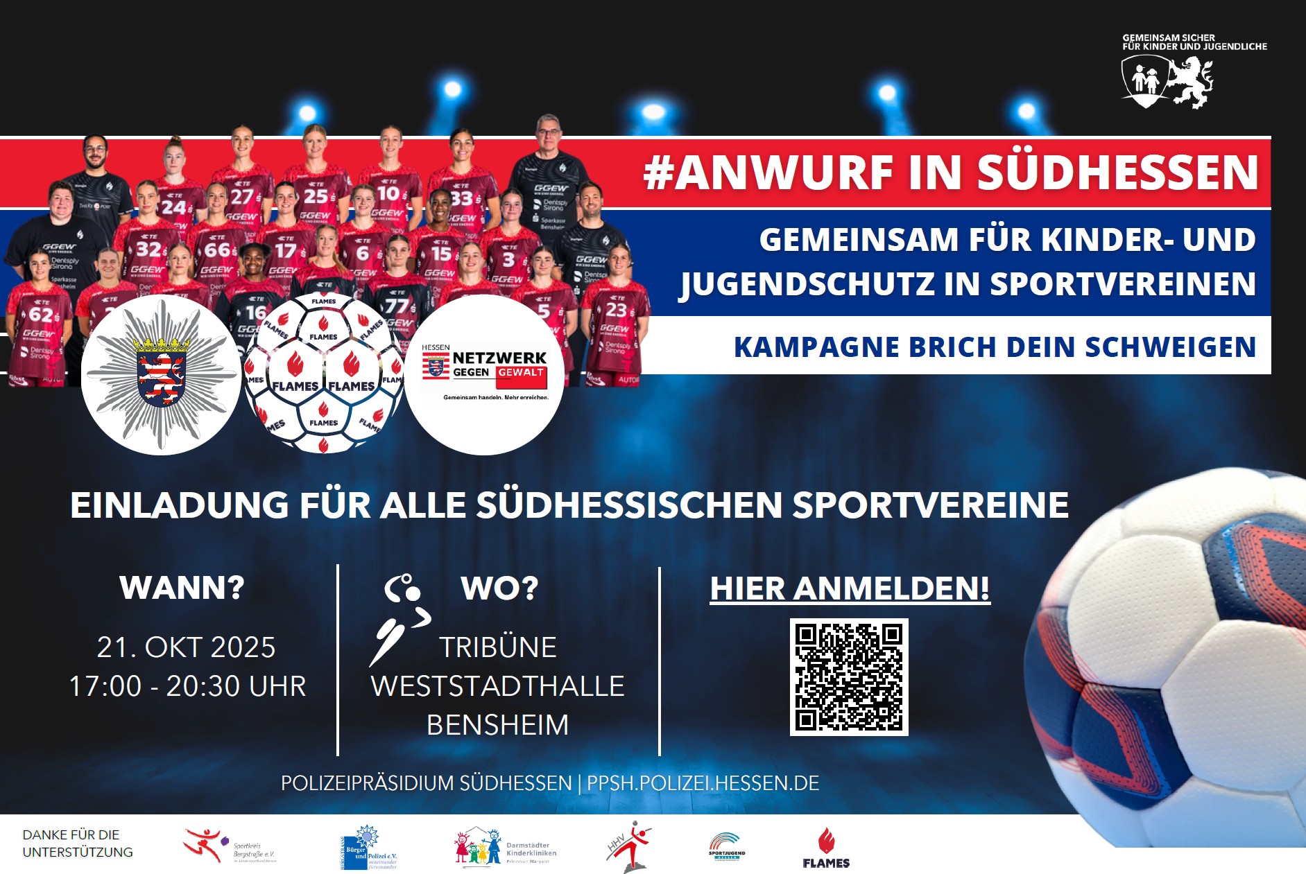 Deshalb setzen wir uns mit dem Netzwerk gegen Gewalt, den Bensheim Flames und zahlreiche weitere Partner im Rahmen der Präventionskampagne „Brich dein Schweigen“ wieder entschlossen gegen sexualisierte Gewalt ein.