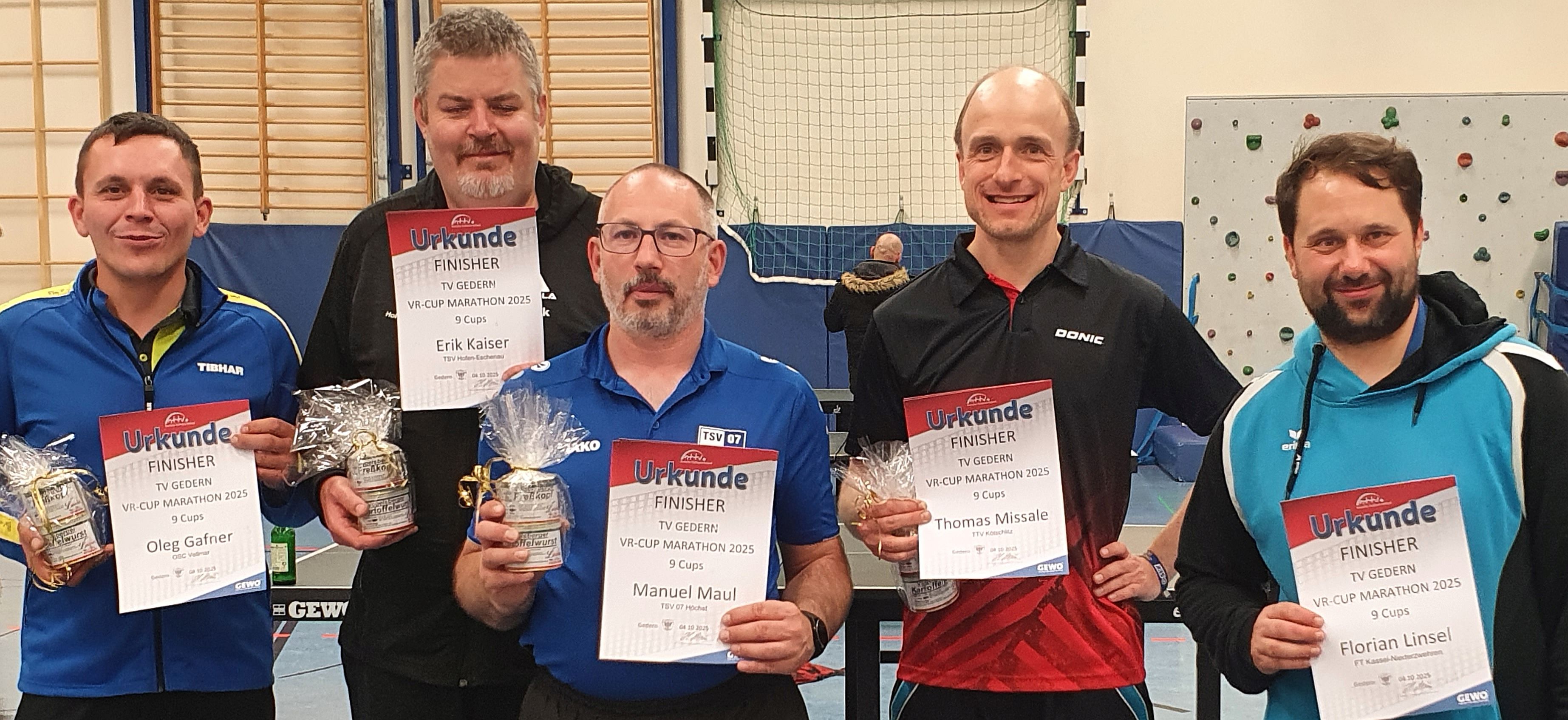 Stolzen fünf Startern gelang die außergewöhnliche Leistung, alle Cups zu bewältigen. Hervorzuheben aus der Crème de la Crème ist Erik Kaiser vom TSV Hofen-Eschenau. Er war bei allen drei Gederner Marathon-Turnieren dabei und hat jetzt als Einziger alle gefinisht. Gedern hatte bereits Marathons mit sieben und acht Cups in Folge angeboten. Nun wurde bei der dritten Auflage noch eins draufgesetzt. Beginn war am Tag der Deutschen Einheit, am Freitag um 10.00 Uhr vormittags. Ende war am Samstag um 22.00 Uhr. Das bedeutete 36 Stunden Tischtennis am Stück.