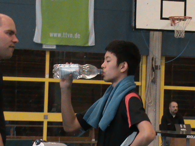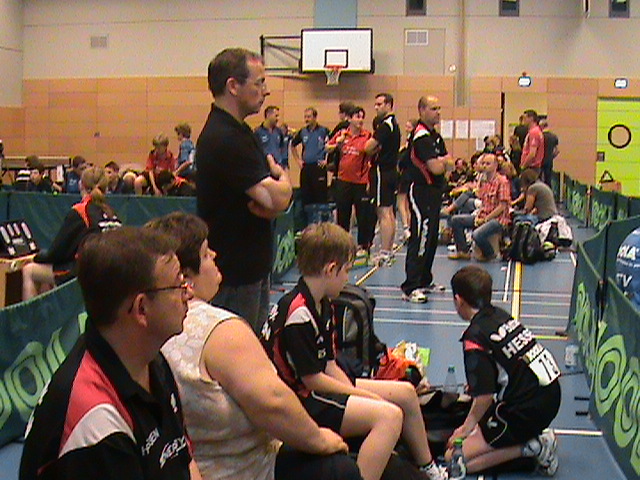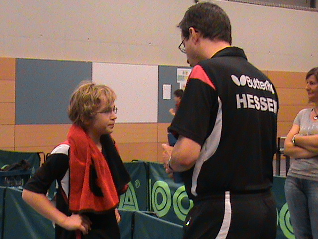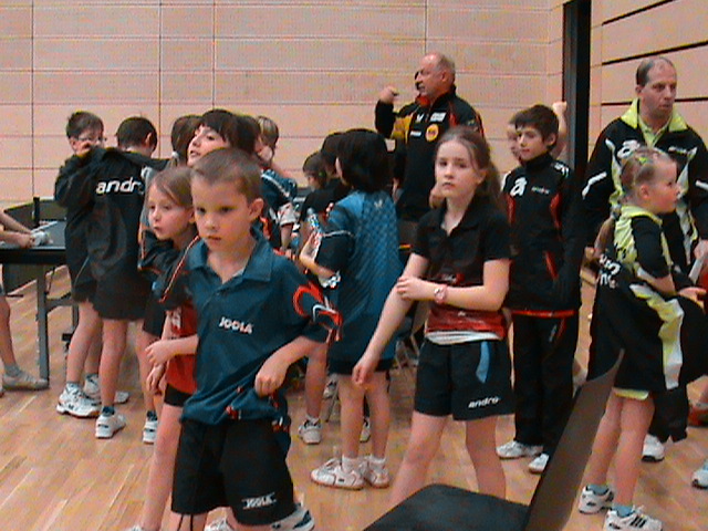 Punkt 9 Uhr begannen dann die Mannschaftskämpfe an 16 Tischen im System „Jeder gegen Jeden“. War man noch etwas locker beim Einspielen und vorbereiten auf die Wettkämpfe, musste man schon vom ersten Ballwechsel gegen die heißesten Talente der stärksten Verbände Deutschlands alles geben, um nicht ganz unter die Räder zu kommen oder (meist knappe) Siege einzufahren. Hitzige Atmosphären entwickelten sich nicht nur bei den Spielerinnen und Spieler, auch die Trainer, Betreuer und vereinzelt auch die mitgereisten Eltern, die sich gerne im Halleninnenraum wegen fehlender Tribünen platziert hatten, waren nicht immer mit den Leistungen ihrer kleinen Lieblinge zufrieden, trösteten sie jedoch ganz liebevoll und trieben sie wieder zu neuen Höchstleistungen an....