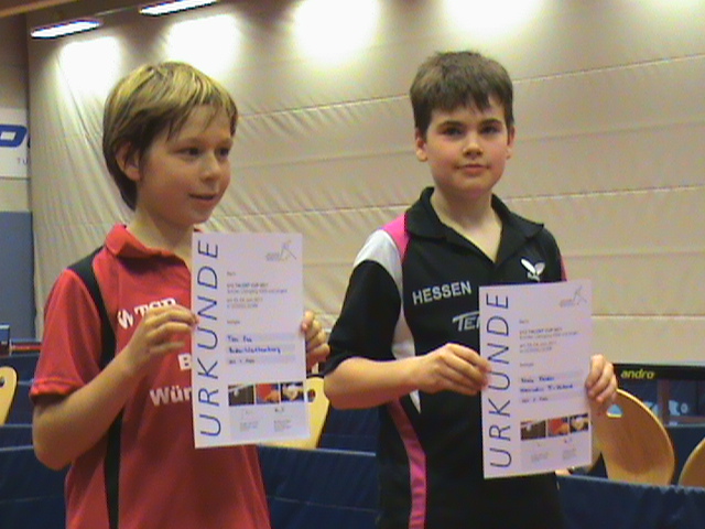 Dabei konnte sich Timo Freund bei den 1999er Jahrgängen bis ins Finale spielen und bezwang da den sehr starken Spieler Hippler aus Niedersachsen knapp mit 3:2 Sätzen. Große Freude anschliessend bei Timo Freund und Betreuerin Sonja Bott über diesen tollen Erfolg!