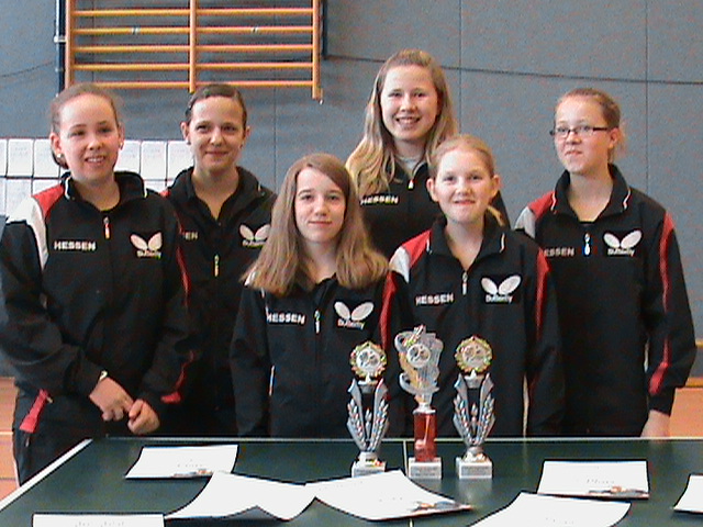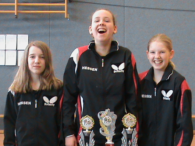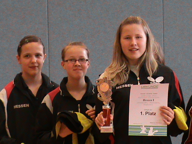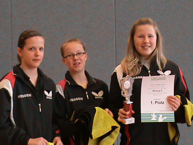 Dem A-Team mit Carina Schneider, Anna Kegelmann und Janina Kämmerer gelang dies recht souverän, wobei im Spiel gegen Schleswig-Holstein ein knapper 4:3 Erfolg zum Gruppensieg beitrug. Im damit erreichten Halbfinale drohte dann das Turnieraus gegen Niedersachsen, doch mit kämpferischer Einstellung und wohlüberlegter Spielweise zog man sich gegen die gefährlichen Materialspielerinnen selbst noch den Hals aus der Schlinge (4:3 Sieg). Im Finale angekommen lag man dann gegen den Gastgeber Thüringen schnell mit 0:2 im Rückstand. Doch mit einer enormen Kraftanstrengung wurde mit einem weiteren 4:3 Sieg erstmals der Titelgewinn nach Hessen geholt.